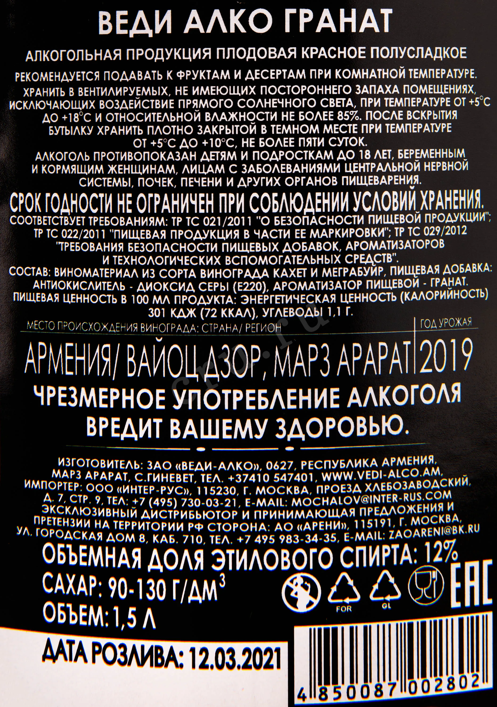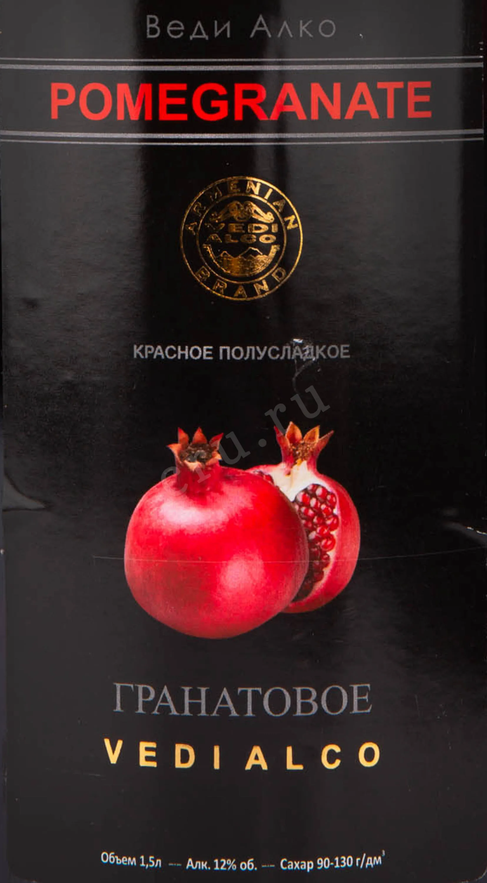 Красное полусладкое вино Vedi Alco Pomegranate 1,5 л представлено в бутылке двойного объема и станет отличным выбором для семейного застолья или пикника. Оно создано по традиционной технологии из винограда автохтонных сортов Меграбуйр и Кахет, которые были выращены на виноградниках Араратской долины. Уникальность вину придает натуральный гранатовый аромат. За счет ферментации и выдержки в стальных резервуарах напиток сохранил удивительную свежесть и приятную сладость. Он обладает ярким армянским колоритом и привлекает внимание стильным оформлением.