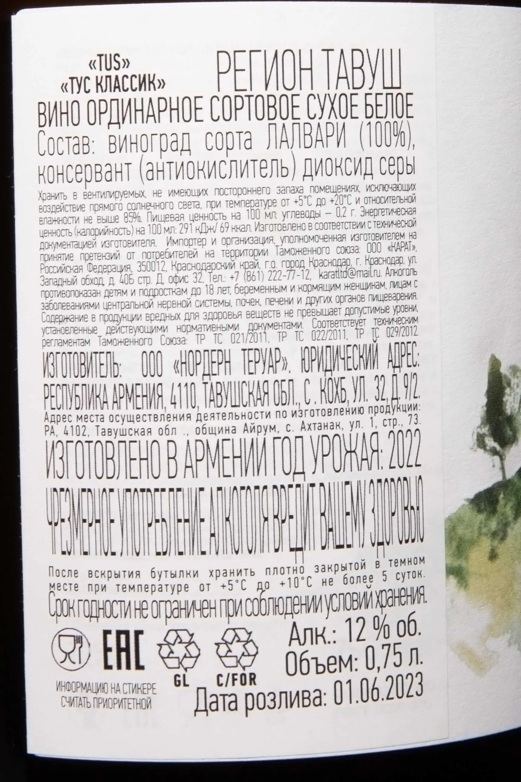 Белое сухое вино Tus Classic White Dry 0,75 л — это элегантный представитель армянского виноделия, сочетающий свежесть цитрусовых тонов и мягкость вкуса. Производитель — винная компания Northern Terroir владеет собственными виноградниками. Лозы автохтонного сорта Лалвари растут у подножия горы Лалвар в Тавушском районе на высоте около 500 метров. Почвы здесь бедные, каменистые, с высоким содержанием известняка и вулканических пород. Ферментация проходит в резервуарах из нержавеющей стали с контролем температуры, что сохраняет свежесть и аромат вина. Выдержка осуществляется в чанах из нержавеющей стали. Напиток с самобытным характером отмечен положительными отзывами критиков и входит в рейтинги лучших армянских вин.