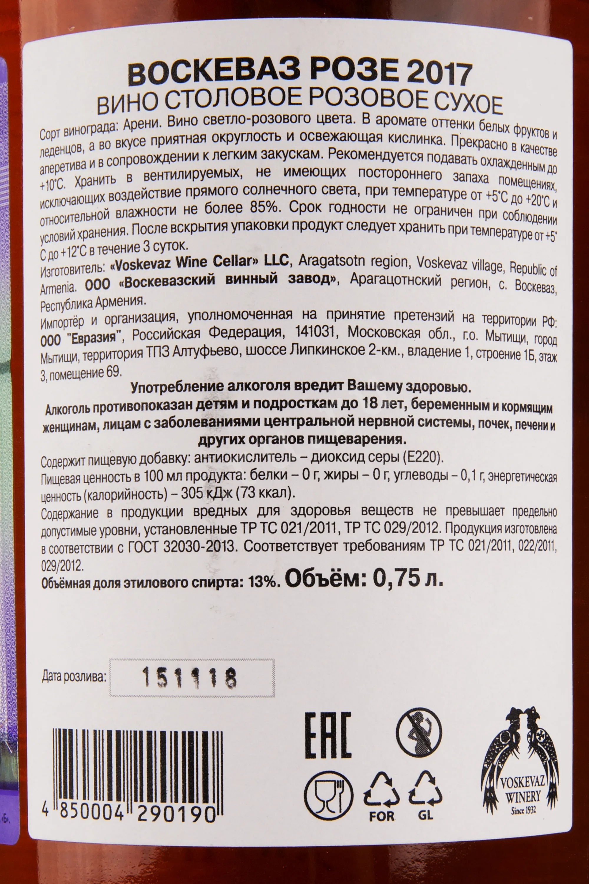 Вино Voskevaz Rose 0,75л создано хозяйством Шато Воскеваз, расположенным у подножья горы Арагац, в регионе Арагацотн. Вино рождается из коренного армянского сорта Арени, выращенного на высоте около 1000 метров над уровнем моря. Особенность технологии «Розе де Сеннье» заключается в кратковременном контакте сока винограда с кожицей, после чего происходит бережная ферментация при низких температурах около 16–18 C, позволяющая сохранить естественную свежесть и тонкость вкуса. Отличительной чертой этого вина является признание экспертов: его отмечают за тонкое сочетание традиций армянского виноделия и современных методов производства, благодаря чему оно стало популярным на международных выставках и дегустациях среди специалистов.
