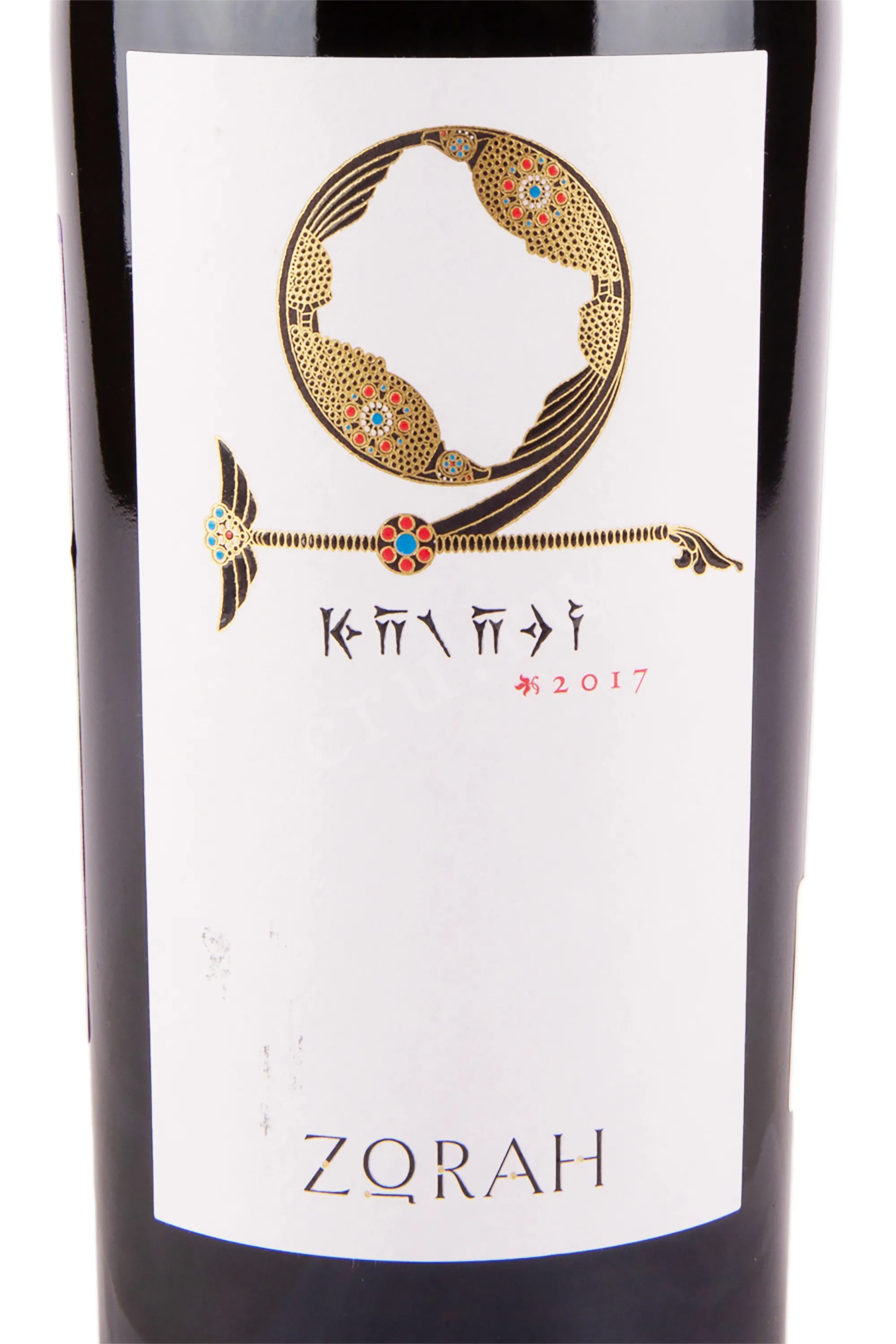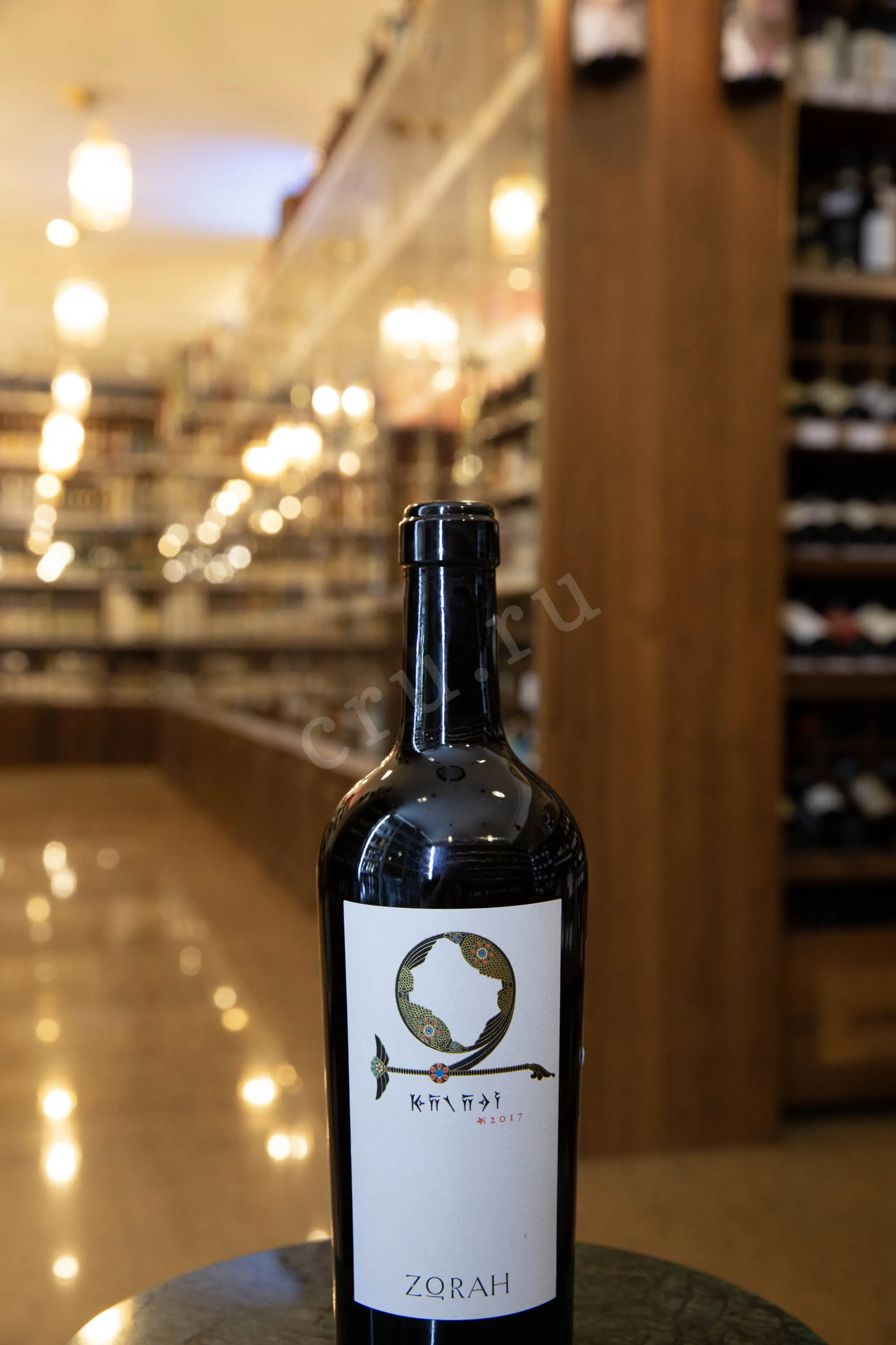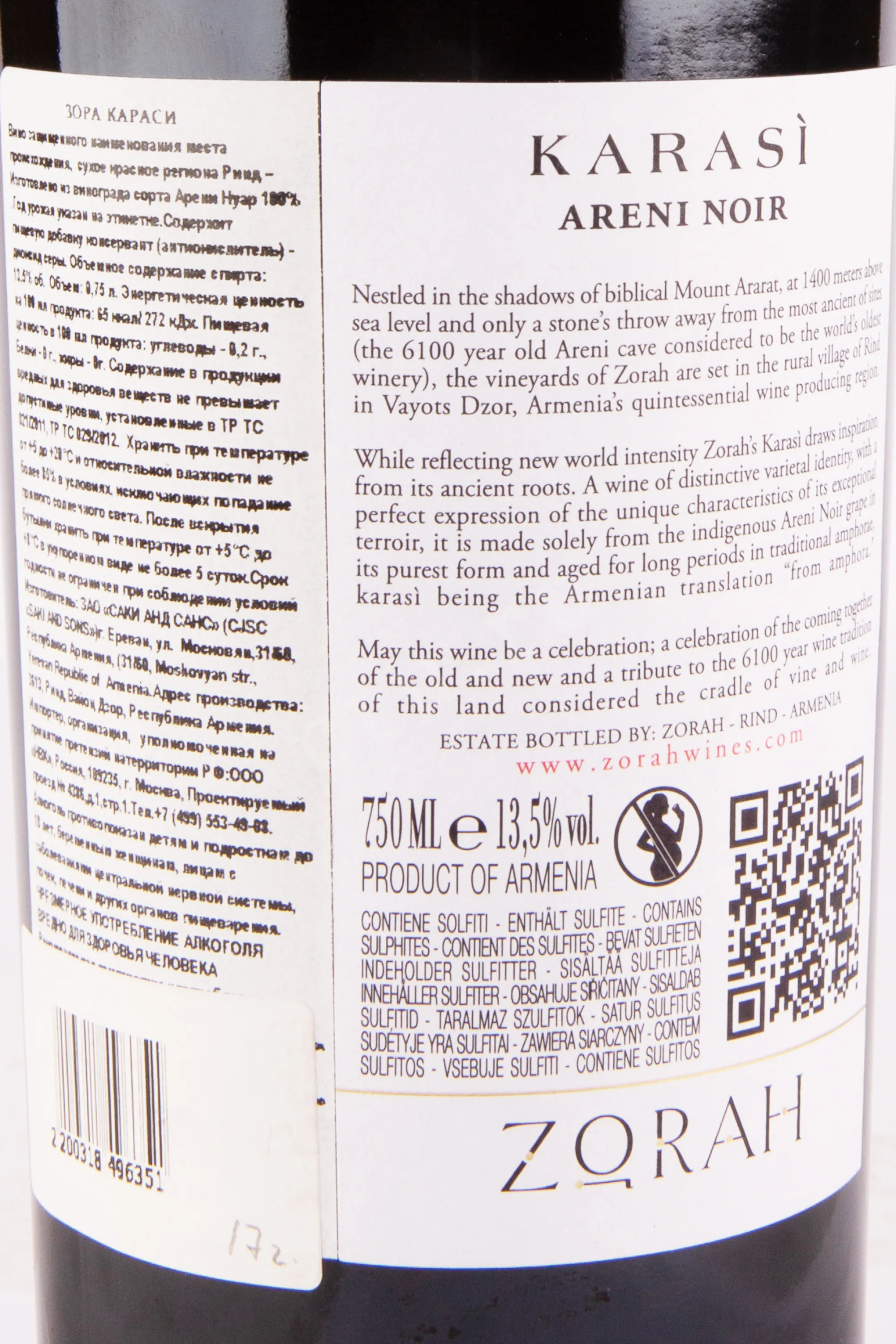 Красное сухое вино Zorah Karasi 2017 года 0,75 л ярко отражает характер древнего армянского сорта Арени. Производителем является винная компания Зора Гарибяна «Саки Анд Санс». Виноград выращен в самом сердце региона Вайоц-Дзор, на склонах на высоте около 1500 метров над уровнем моря. Почвы каменистые, известково-песчаные, без филлоксеры. Сбор урожая ручной. Брожение естественное, после его завершения осуществляется выдержка около года в традиционных глиняных сосудах «караси», частично погружённых в землю и находящихся в маранах (винных погребах), где земля является регулятором температуры. Затем ещё полгода вино созревает в бутылках. Зора Арени вошло в рейтинги ведущих винных критиков, набрав 91–93 балла. Оно ценится за чистоту вкуса и аутентичный характер.