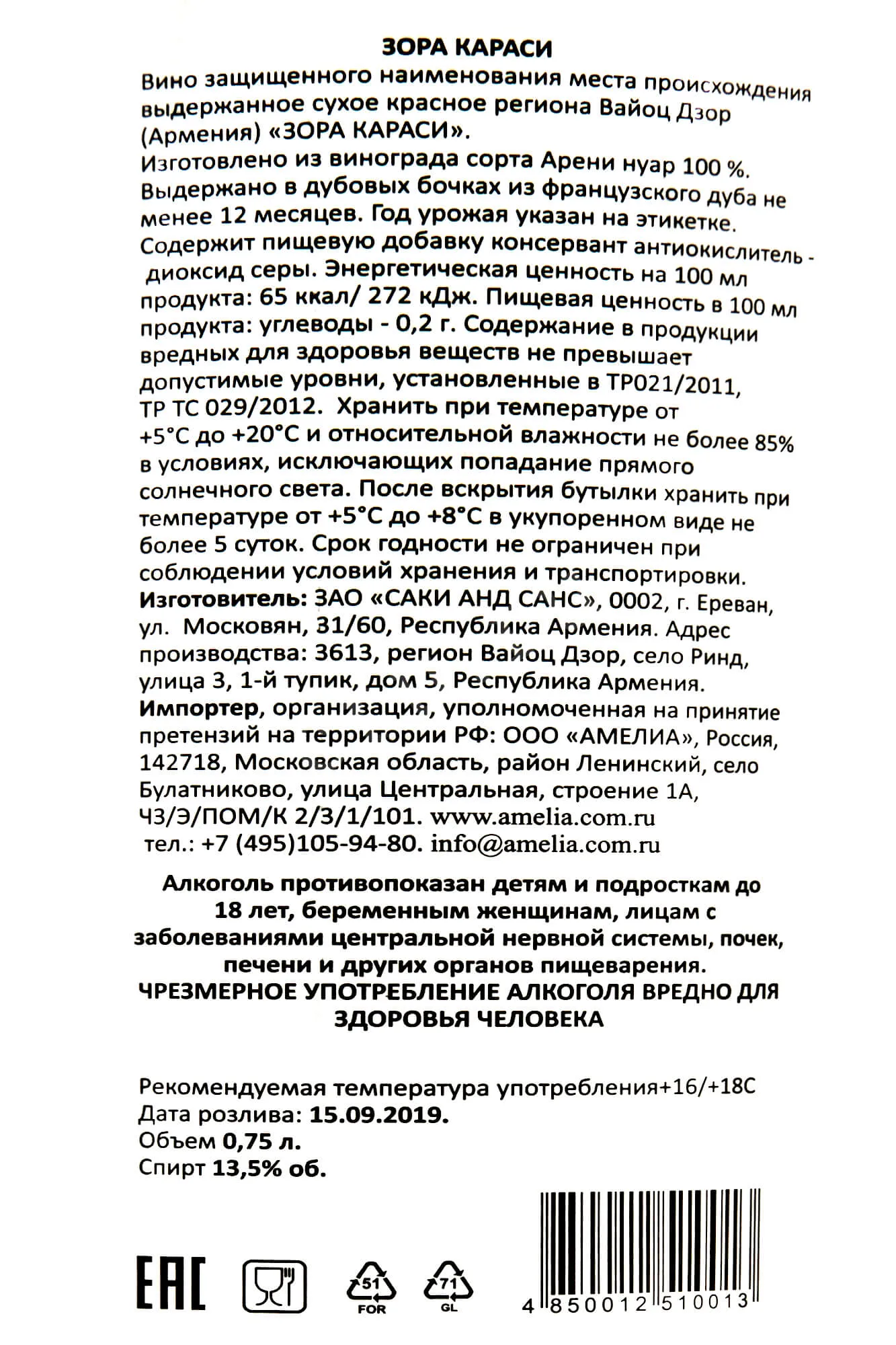 Зора Караси 2018 0,75 л — утончённое красное сухое вино от армянской компании «Саки Анд Санс», изготовленное из местного винограда Арени, выращенного на высокогорных терруарах региона Вайоц Дзор. Винификация проходит в нейтральных ёмкостях с последующей выдержкой в в больших местных амфорах, известных как «караси» не менее 12 месяцев, что формирует богатую и сложную палитру.