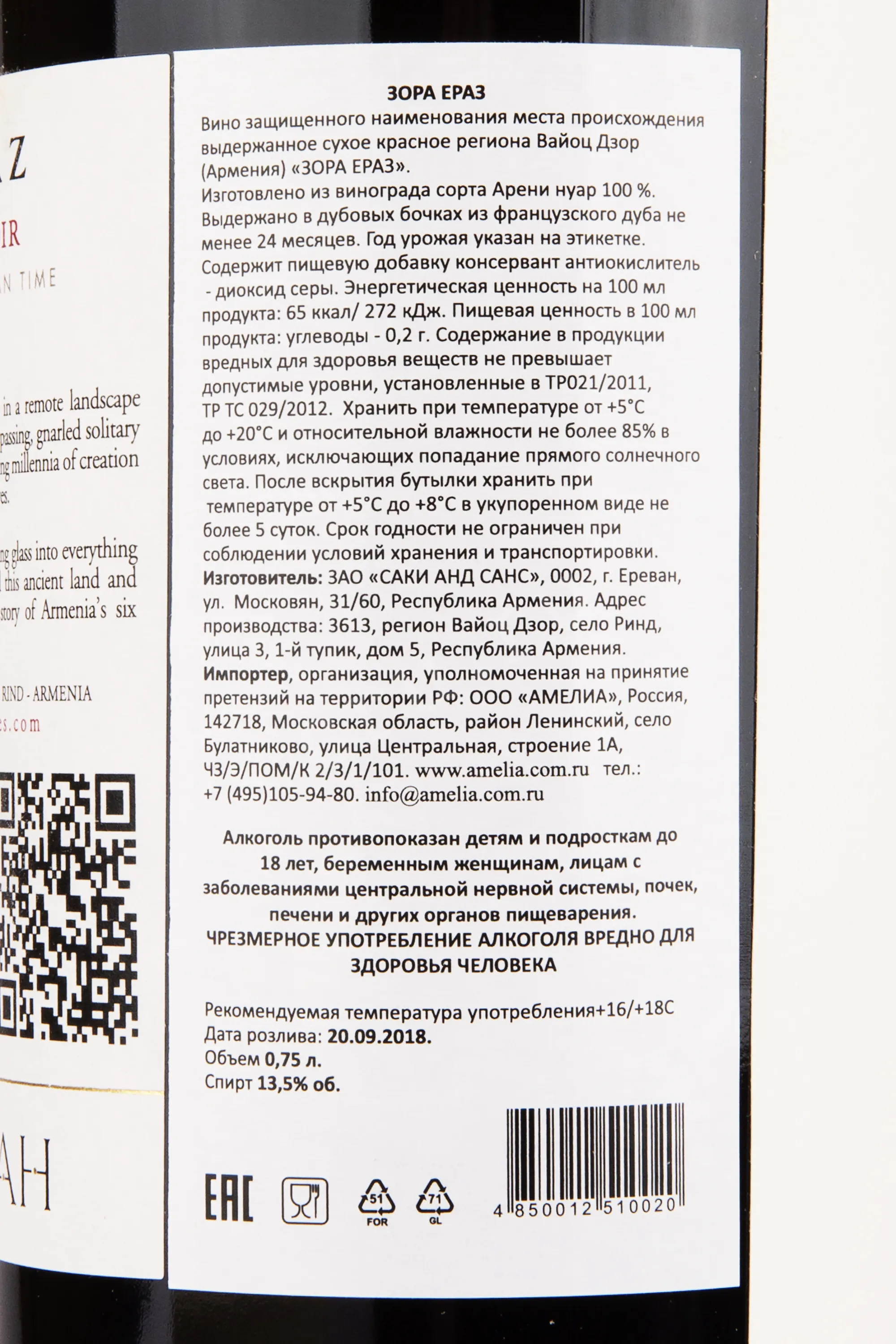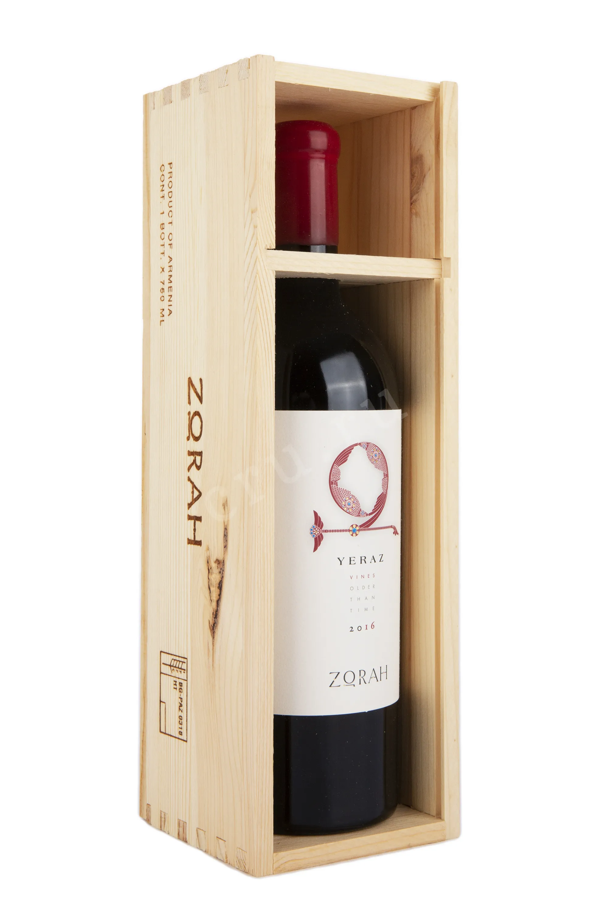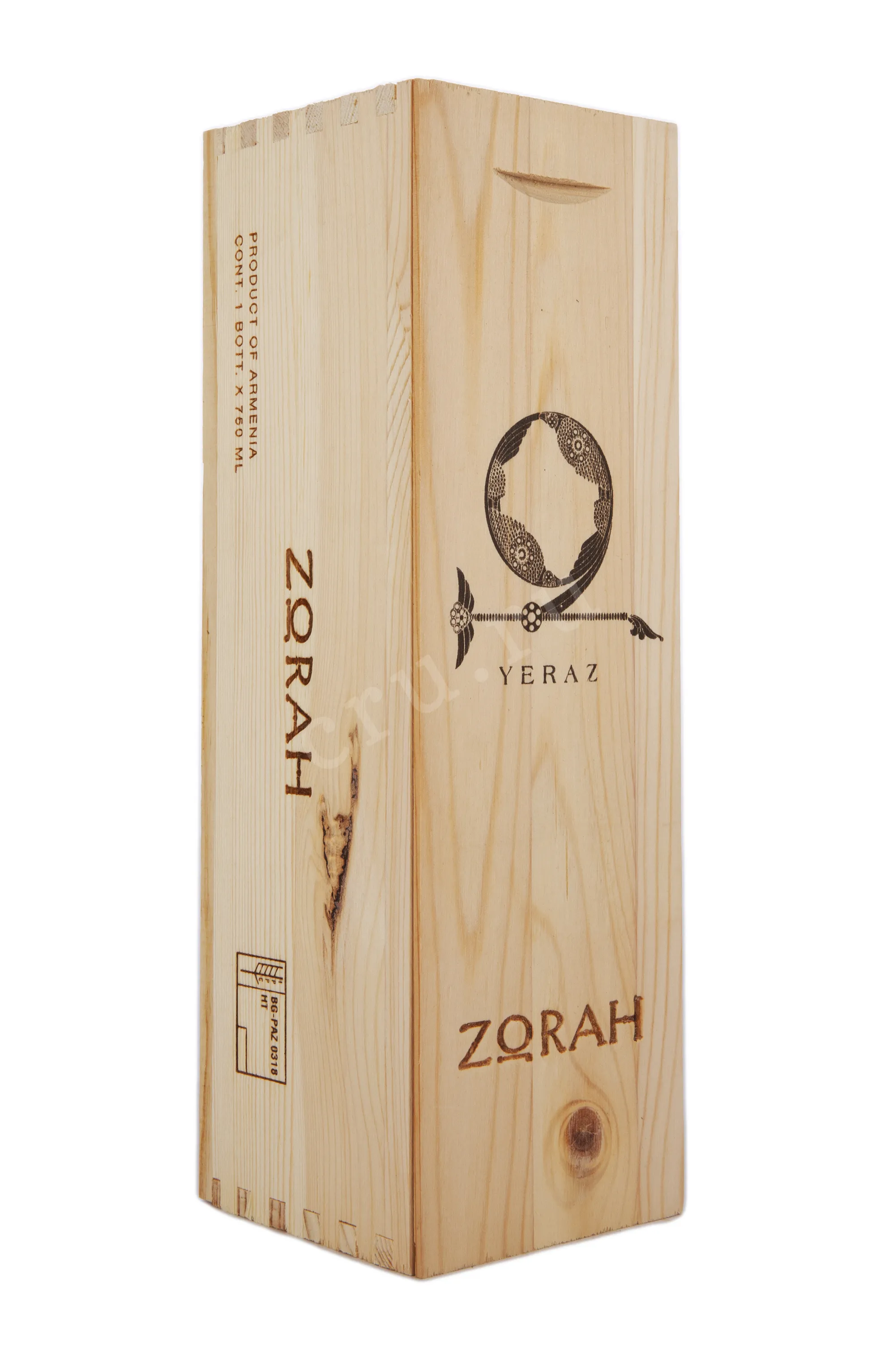 Красное сухое вино Zorah Yeraz 2013 года 0,75 л в деревянном ящике производит винная компания из Армении «Саки энд Санс», используя автохтонный сорт Арени. Он был выращен в регионе Вайоц Дзор на склонах высотой 1400-1600 метров с вулканическими каменистыми почвами. Возраст посаженных здесь лоз достигает 100 лет. Они выжили вопреки суровым условиям и дают небольшие, но великолепные по качеству урожаи. Вино создавалось совместными усилиями главы компании Зора Гарибяна, винодела с мировым именем Альберто Антонини и ампелографа Стефано Бартоломеи. Оно получилось насыщенным и выразительным по своему стилю, благодаря выдержке в традиционных глиняных сосудах — карасах разных размеров, часть которых закопана в землю и запечатана воском, и в больших необожженных бочках, придавших структуру, бархатистость и баланс. Для ферментации использовались исключительно натуральные дрожжи. После выдержки вино легко фильтровали и оставили дозревать в бутылке еще на год. Оно получило высокие оценки от международных критиков и входит в число лучших образцов армянского виноделия.