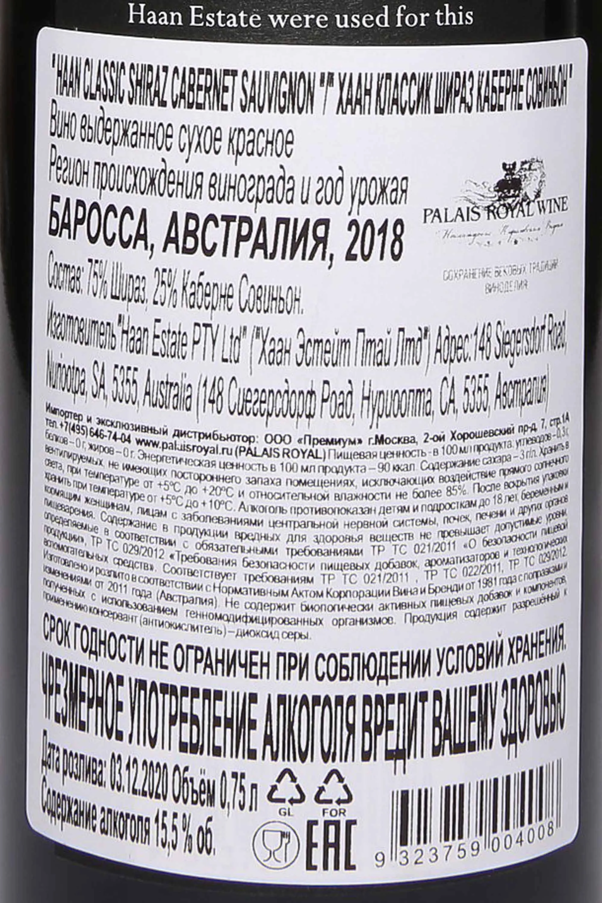 Красное сухое вино Haan Classic Shiraz Cabernet Sauvignon 2018 г. 0,75 л создано в регионе Баросса в Южной Австралии. Это один из лучших терруаров для выращивания винограда в стране и в мире. Здесь преобладают песчаные и глинистые почвы, а климат отличается жарким летом и мягкой зимой. Сезоне сбора был отмечен теплой погодой и редкими дождями, что обеспечило ягодам высокую концентрацию сахара и богатый фенольный состав. Производитель сочетает традиционные методы винификации с современным контролем температуры, что позволяет сохранить чистоту вкуса и сбалансированную структуру напитка. Выдержка проходила в дубовых бочках, часть которых была новой, благодаря чему купаж приобрел сложный ароматический профиль и дополнительную глубину во вкусе.