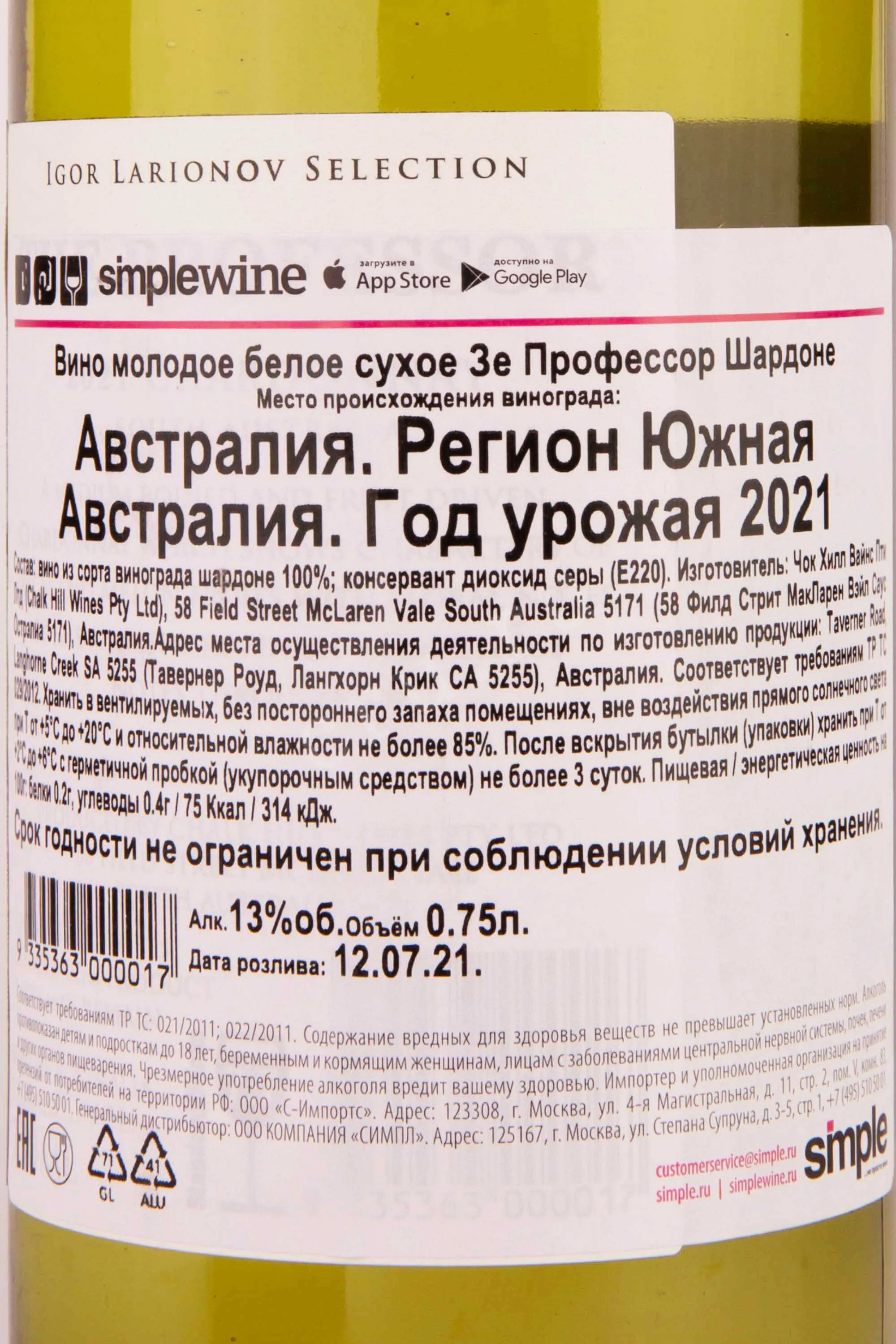 Larionov The Professor Chardonnay 0.75 л купить - Австралийское вино Ларионов Зе Профессор Шардоне цена в магазине г. Москва, ул. Профсоюзная, д. 16/10 10:00-22:00 Ежедневно +7 (495) 920-20-02 info@cru.ru