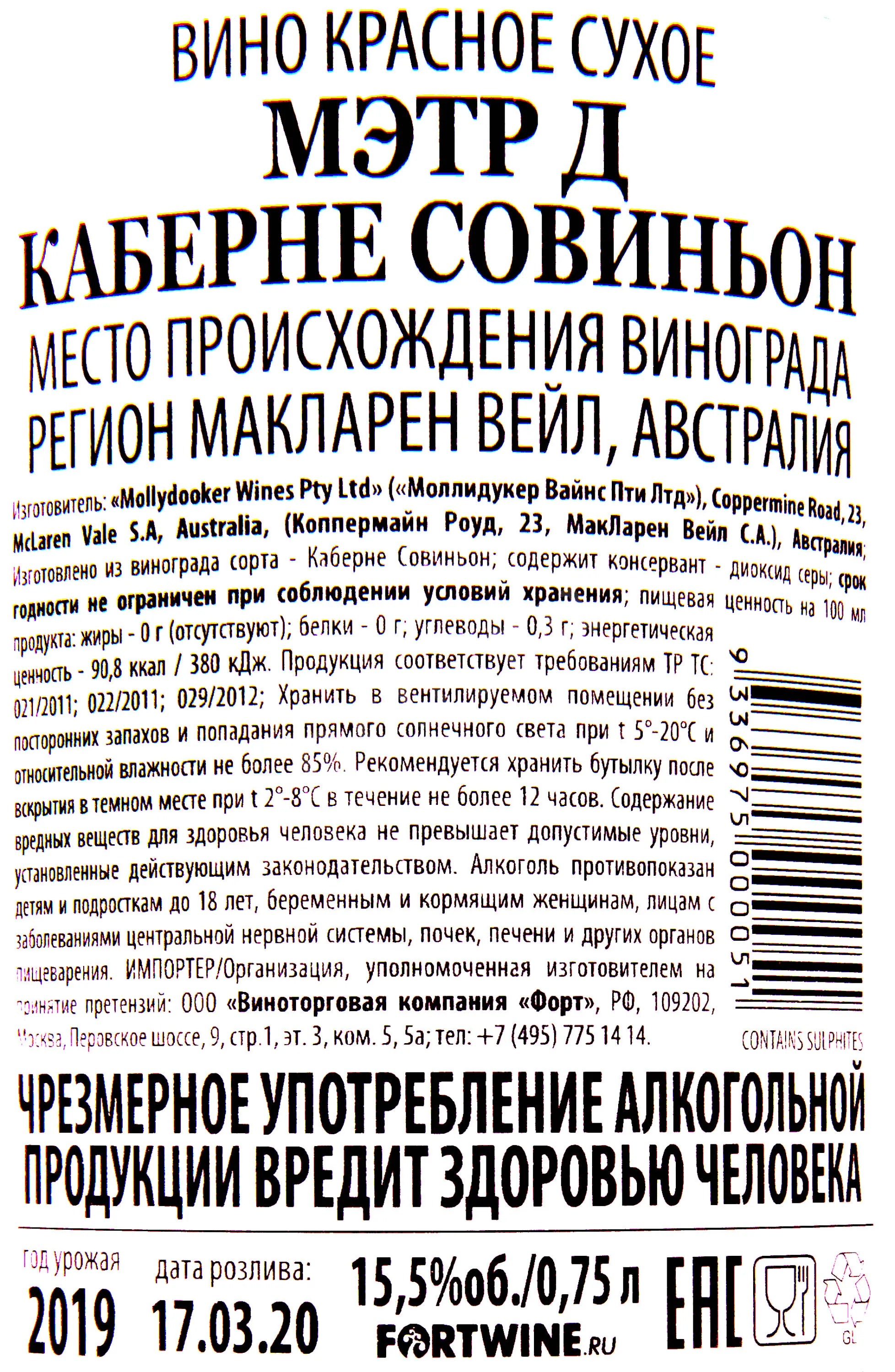 Mollydooker Maitre D Cabernet Sauvignon 0.75 л купить - Австралийское вино Моллидукер Мэтр Д Каберне Совиньон цена в магазине г. Москва, ул. Профсоюзная, д. 16/10 10:00-22:00 Ежедневно +7 (495) 920-20-02 info@cru.ru