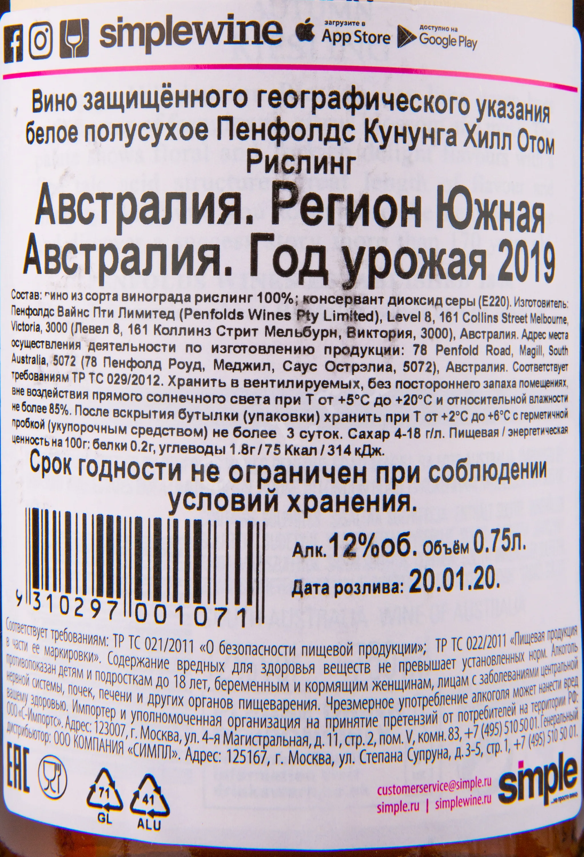 Вино Penfolds Koonunga Hill Autumn Riesling 2019 0.75 л создано из тщательно отобранного винограда региона Южная Австралия, собранного в осенний период, что позволило ягодам максимально накопить вкусовые и ароматические характеристики. Ферментация проходила при низких температурах в стальных ёмкостях, благодаря чему сохранилась яркая свежесть и чистота фруктовых оттенков напитка. Особенностью технологии являлась минимальная выдержка перед бутилированием, которая обеспечила сохранение живой кислотности и утончённости вкуса.