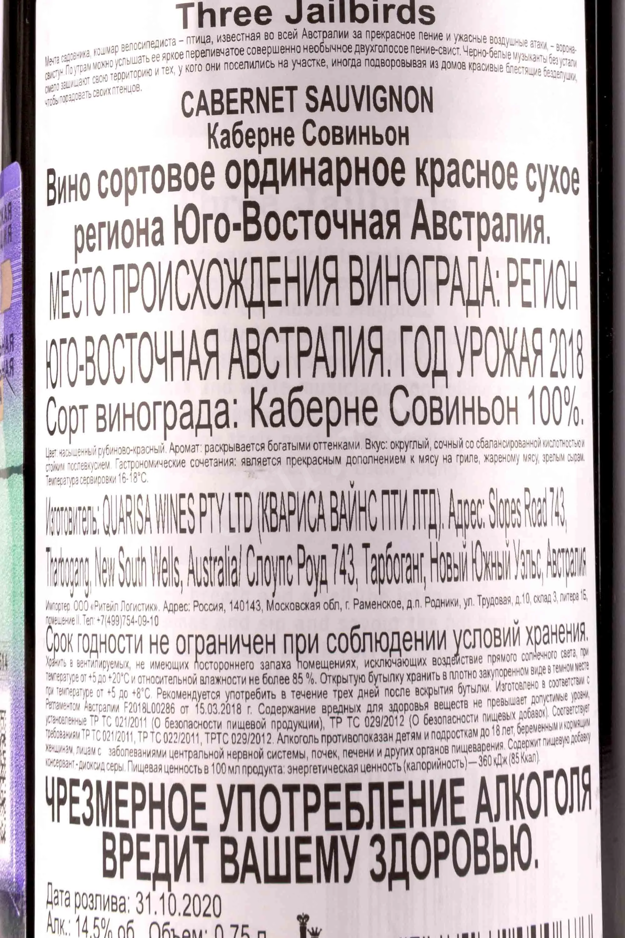 Вино Three Jailbirds Cabernet Sauvignon 2018 0.75 л родилось на живописных холмах Южной Австралии, где жаркое солнце и прохладный бриз сформировали особый микроклимат, идеальный для выращивания Каберне Совиньон. Урожай собирали вручную ранним утром, отбирая исключительно зрелые ягоды, которые затем ферментировались при контролируемой температуре в дубовых чанах. Благодаря выдержке в бочках из французского дуба на протяжении 12 месяцев напиток приобрёл сложную структуру и элегантность с тонким балансом танинов.