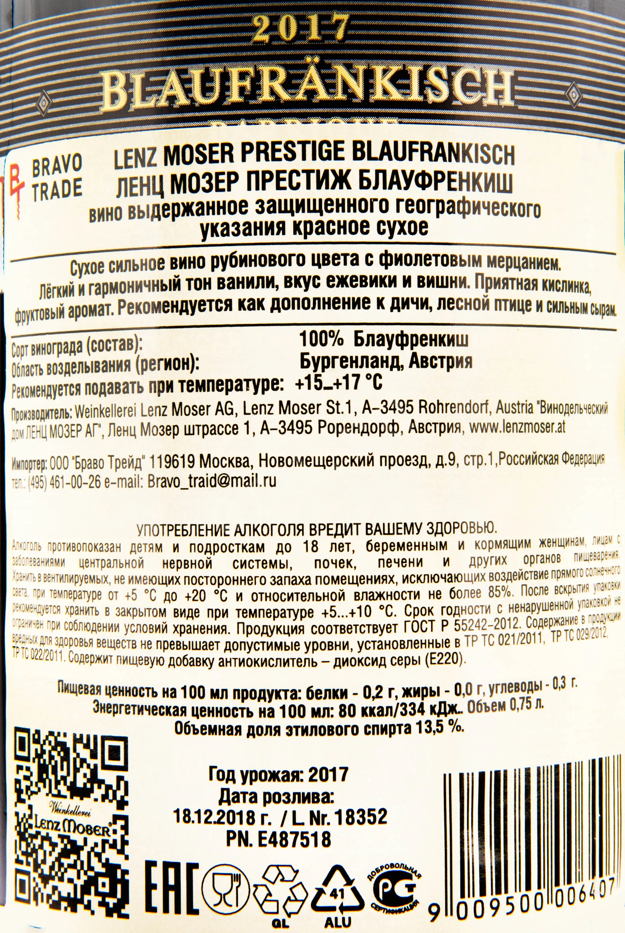 Lenz Moser Prestige Blaufrankisch 0.75 л купить - Австрийское вино Ленц Мозер Престиж Блауфренкиш цена в магазинег. Москва, ул. Профсоюзная, д. 16/1010:00-22:00 Ежедневно+7 (495) 920-20-02info@cru.ru