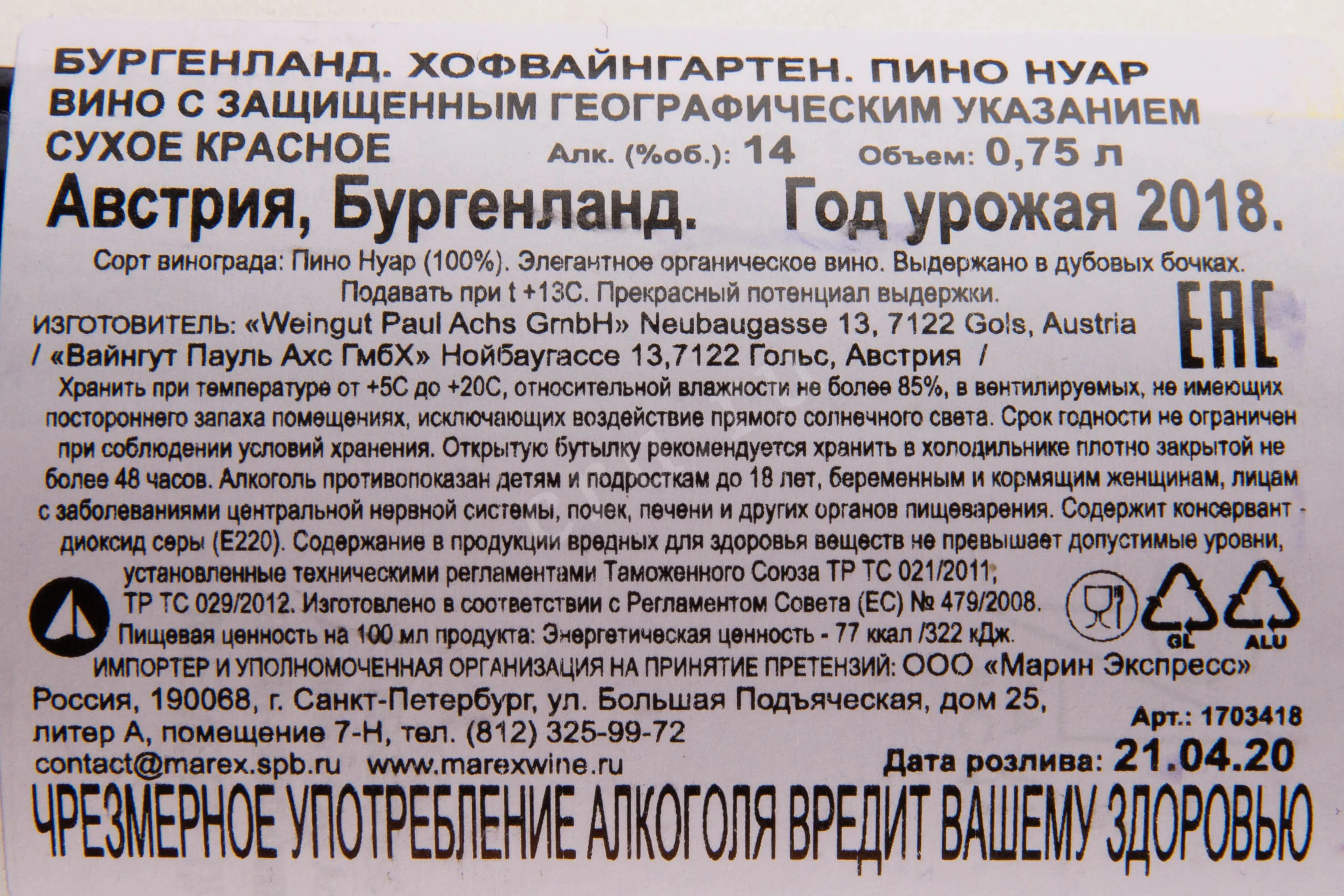 Paul Achs Hofweingarten Pinot Noir Burgenland 0.75 л купить - Австрийское вино Бургенланд Хофвайнгартен Пино Нуар 2015г цена в магазине г. Москва, ул. Профсоюзная, д. 16/10 10:00-22:00 Ежедневно +7 (495) 920-20-02 info@cru.ru