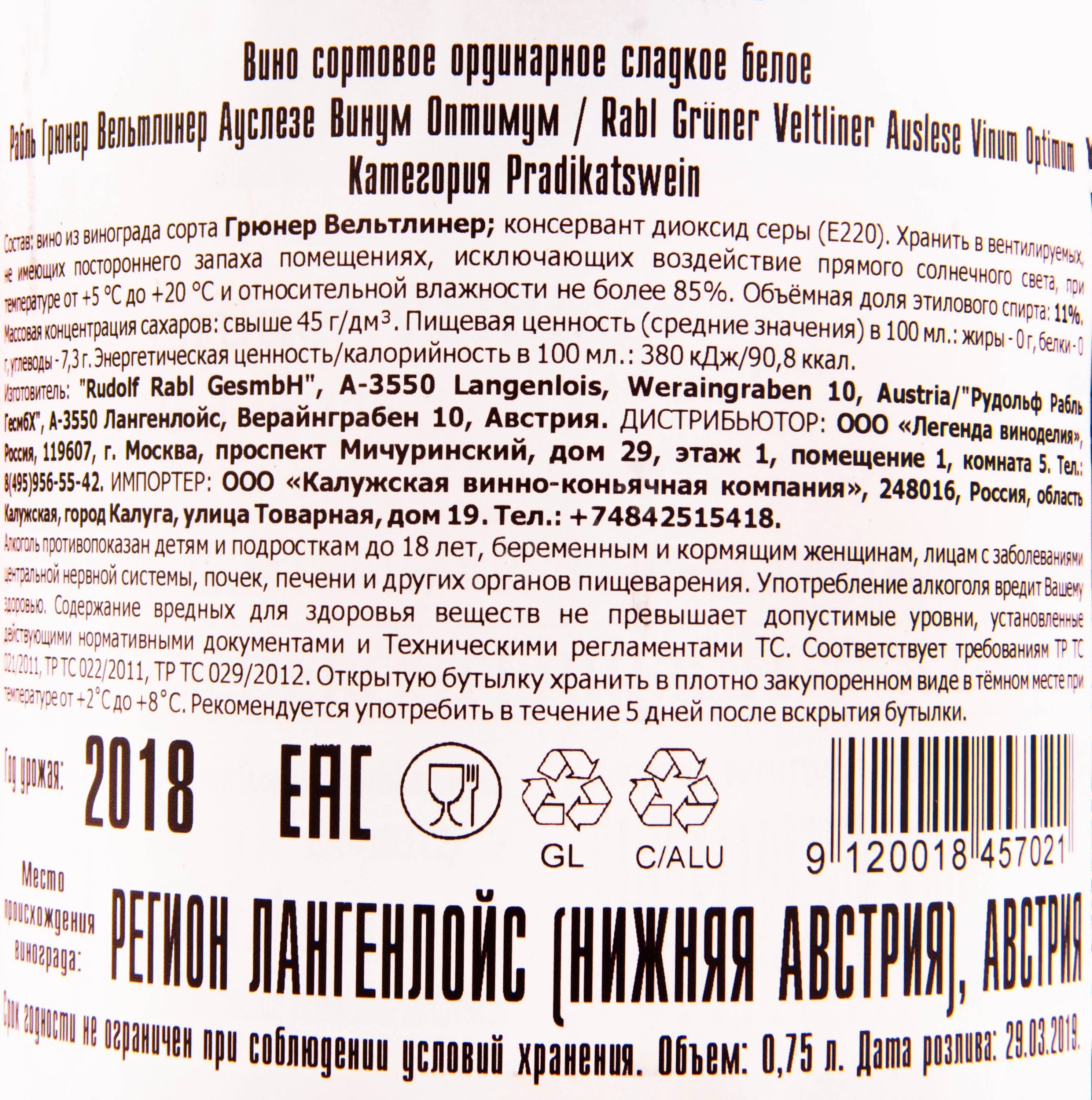 Белое сладкое вино Rabl Gruner Veltliner Auslese Vinum Optimum - это напиток из ассортимента премиум-класса, который производится из винограда Gruner Veltliner, выращенного на склонах холмов Langenlois. Название Rabl означает «удовольствие высочайшего уровня». Сбор винограда происходит вручную со старых лоз возрастом не менее 25 лет и старательно сортируется. Собранный урожай хранится на протяжении 12 часов, после чего ферментируется в металлических резервуарах при температуре 20 градусов и разливается по бутылкам. Благодаря микроклимату и земле, богатой минералами, получаются разные по стилю вина. Данный напиток поражает разнообразием вкусов и ароматов, делая его по-своему уникальным.