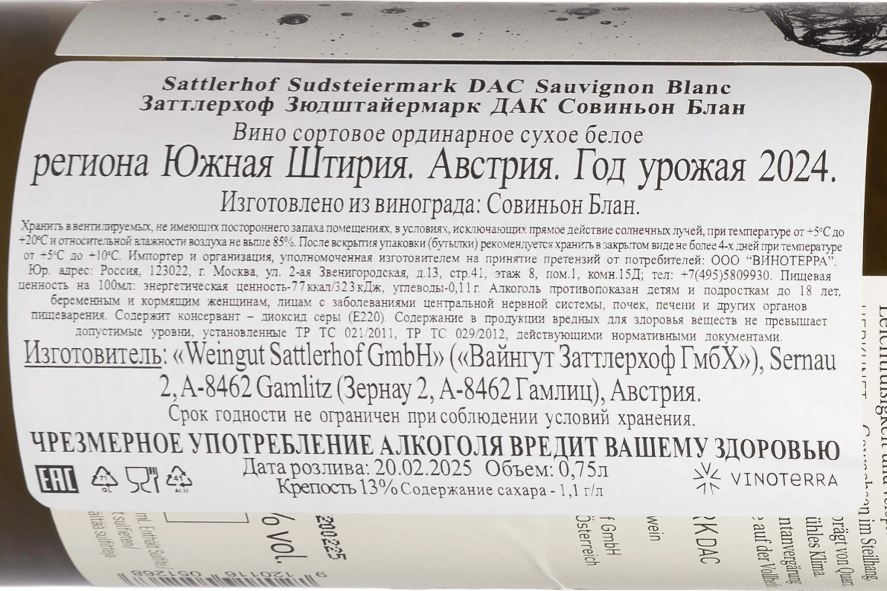 Вино Sattlerhof Sudsteiermark Sauvignon Blanc 0.75 л — изящный представитель региона Южная Штирия, созданный вручную с применением биодинамических принципов на винодельне семьи Заттлер. Урожай собирается исключительно вручную, тщательно отбираются только идеальные ягоды, выращенные на крутых склонах с минерализованными сланцевыми и известняковыми почвами. Винификация проходит в стальных емкостях при контролируемой низкой температуре, что сохраняет свежесть, чистоту и выраженную минеральность, отражающую уникальный терруар. Благодаря климатическим особенностям региона — тёплым дням и прохладным ночам — напиток обладает яркой кислотностью и тонкой ароматикой.