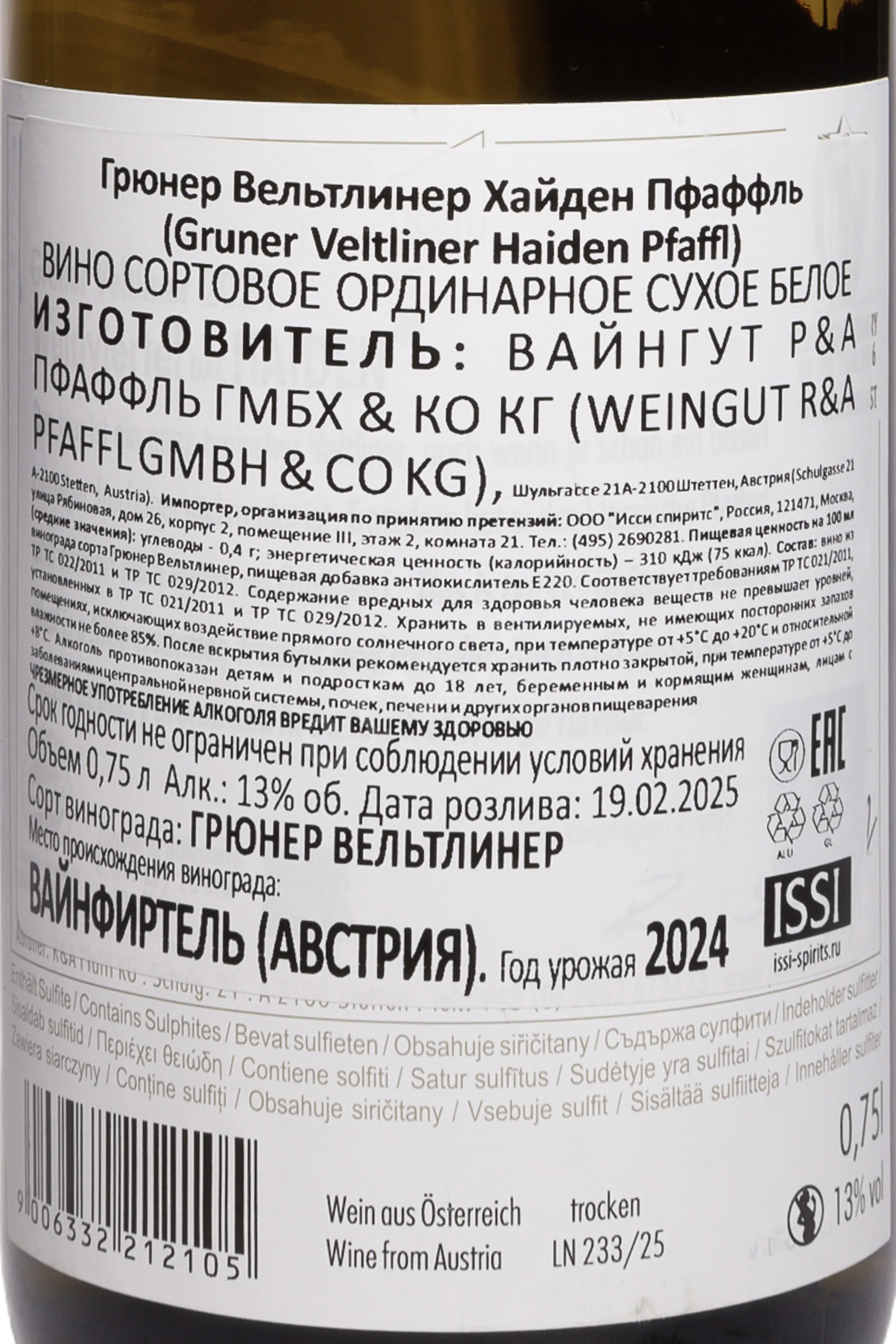 Белое сухое вино Weingut R&A Pfaffl Haiden Gruner Veltliner 2024 года 0,75 л — легкое, с чистой сортовой стилистикой, характерной для австрийского Грюнера Вельтлинера. Виноград был собран на склонах предгорий Бизамберга, где глубокие лессовые почвы и прохладные ветра из долины Дуная дают ягодам необходимую свежесть. В 2024 году были умеренные сезонные температуры и выпало достаточное количество осадков, что обеспечило равномерное созревание винограда. Его собирали в октябре и сортировали прямо на винограднике. На винодельне проводили отделение гребней, мягкое дробление и короткую холодную мацерацию. Ферментация протекала на натуральных дрожжах при температуре около 19 °C. Далее вино выдерживали на осадке пять месяцев в стальных резервуарах.