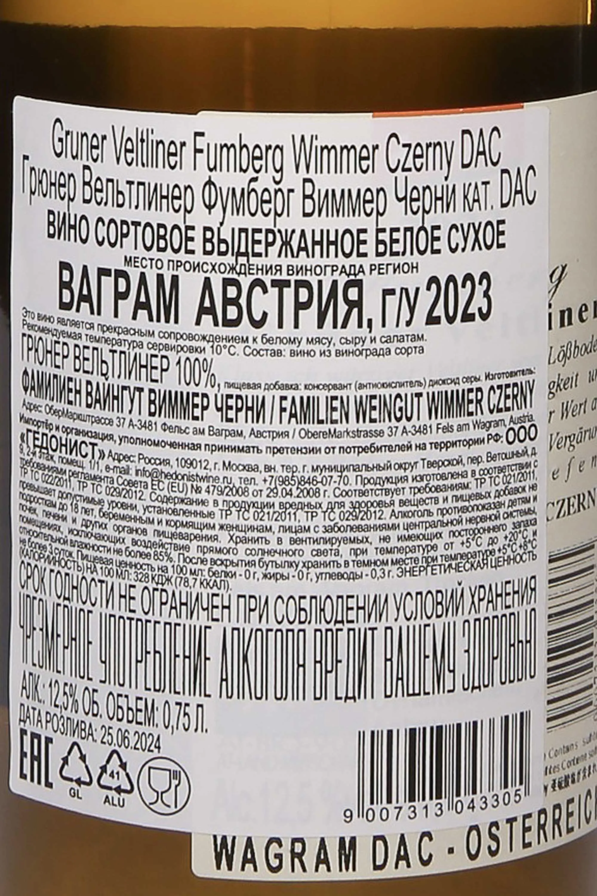 Белое сухое вино Wimmer Czerny Fumberg Gruner Veltliner DAC 2023 года 0,75 л создано в Нижней Австрии, в регионе Ваграм. Виноградник Фумберг расположен посередине склона холма (высота 200-300 м) и знаменит своими лессовыми почвами осадочные ледниковые породы + 20% известняка), которые хорошо удерживают влагу и придают ягодам яркую минеральность. Возраст лоз — больше 45 лет, их обрабатывают с помощью биодинамических методов. Урожай 2023 года в Австрии оказался удачным: весна была мягкой, лето тёплым, с достаточным количеством дождей, а осень сухой и солнечной. Ягоды созрели равномерно, сохранив свежую кислотность. Ферментация проводилась в стальных ёмкостях при контролируемой температуре, чтобы подчеркнуть чистоту сорта. Выдержка проходила недолго, в основном на осадке, что добавило вину объёма и текстуры. Этот выпуск отмечен критиками за гармоничное сочетание свежести и глубины вкуса, что подтверждает стабильное качество винодельни Виммер Черни. Потенциал винтажа 2023 года — 6-8 лет.