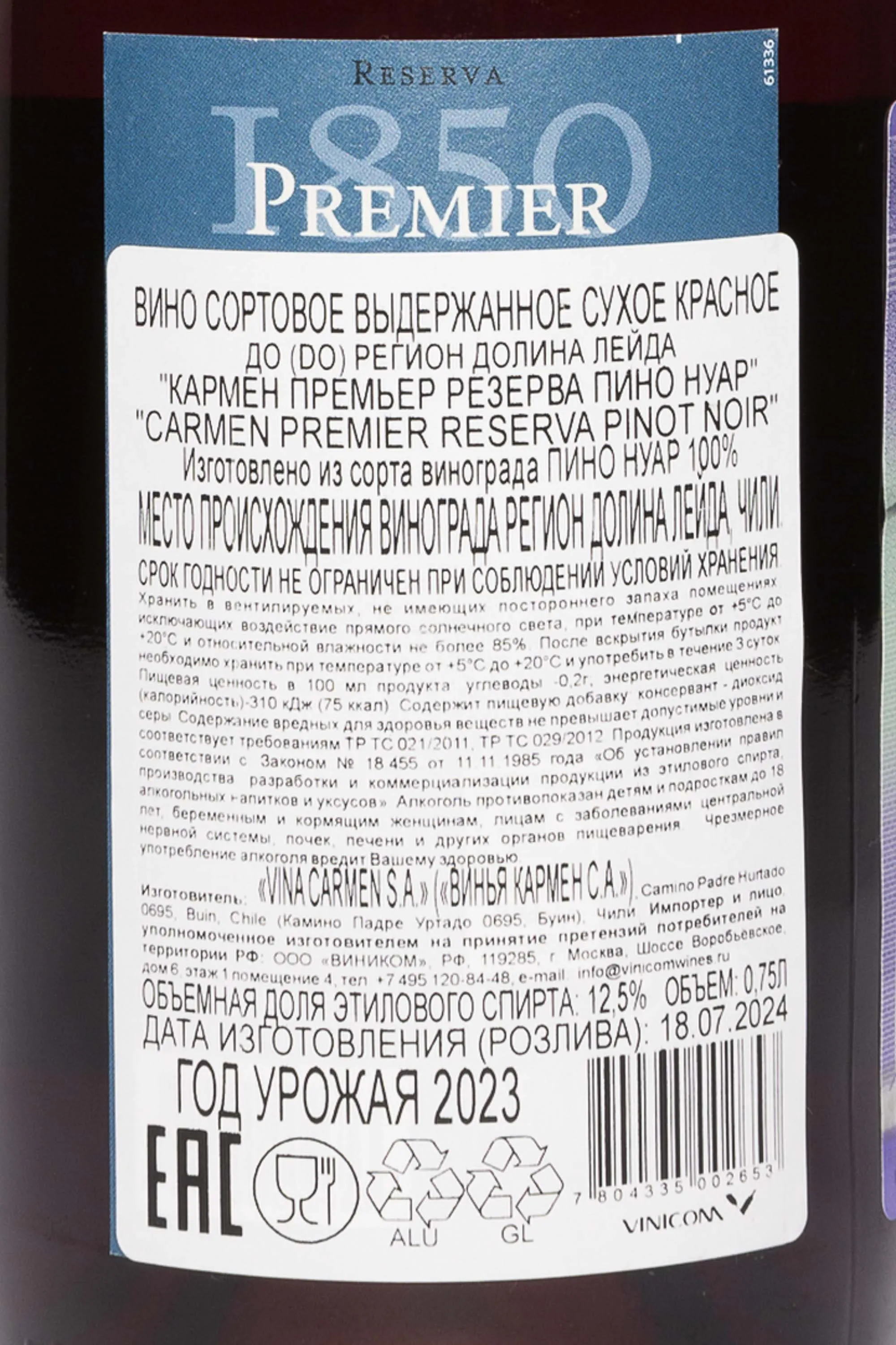Carmen Premier Reserva Pinot Noir 0.75 л купить - Чилийское вино Кармен Премьер Резерва Пино Нуар цена в магазине г. Москва, ул. Профсоюзная, д. 16/10 10:00-22:00 Ежедневно +7 (495) 920-20-02 info@cru.ru