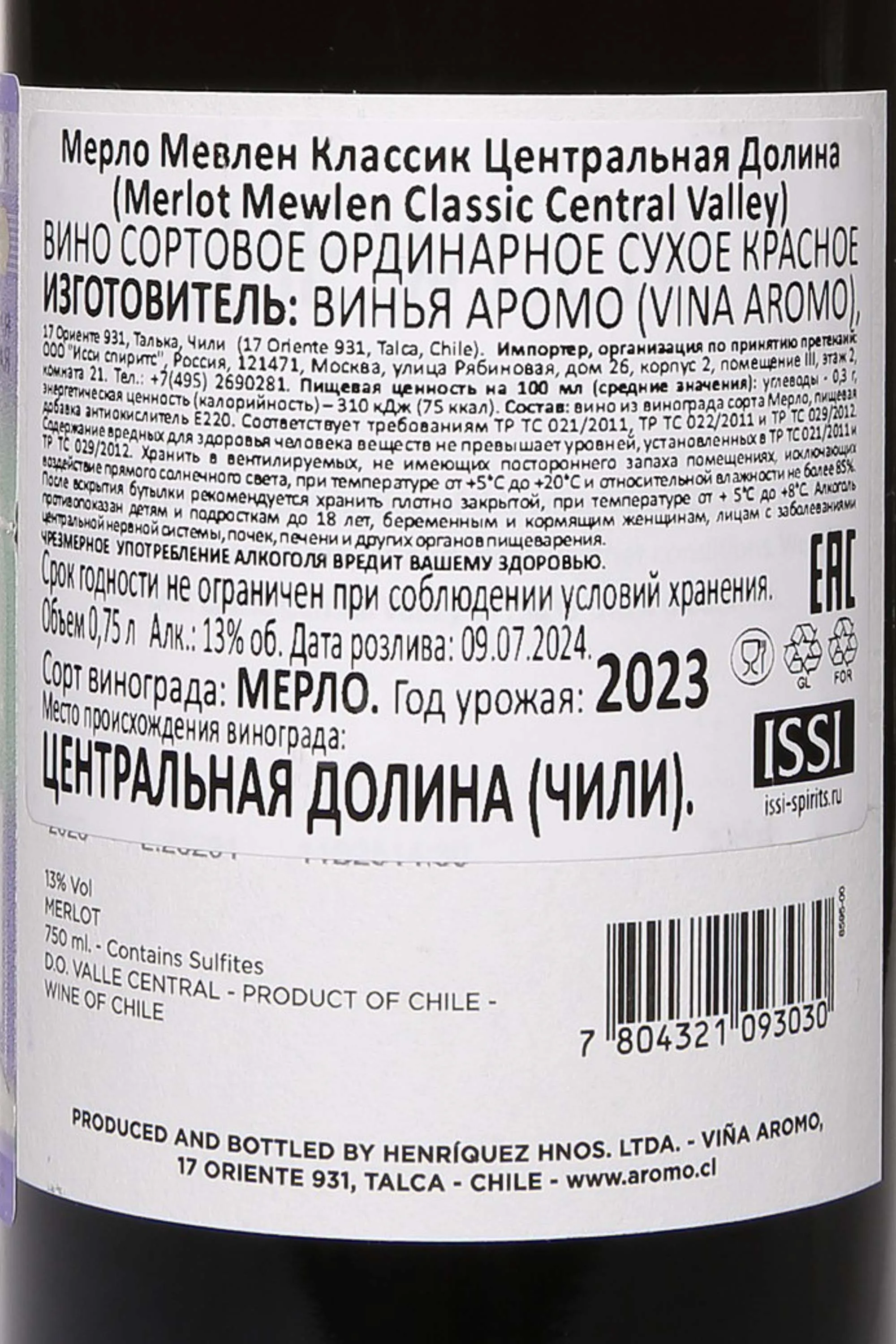 Красное сухое вино Mewlen Classic Merlot Central Valley DO 2023 г. 0,75 л создано в одном из самых известных винодельческих регионов Чили. Центральная Долина тянется вдоль Анд и Тихого океана, что формирует уникальный микроклимат. Днем здесь тепло и солнечно, ночью температура резко падает, из-за чего ягоды хорошо сохраняют кислотность и развивают ароматическую насыщенность. Урожай 2023 года созрел в сезон с умеренной погодой без экстремальных колебаний. Зима была дождливой, благодаря чему почвы накопили достаточно влаги, а лето прошло с мягкой жарой, способствующей равномерному созреванию ягод. Напиток изготовили по классической технологии: ягоды сортировали, отделили от гребней и подвергли ферментации при контролируемой температуре. Выдержка в стали помогла сохранить фруктовую основу и чистоту вкуса.