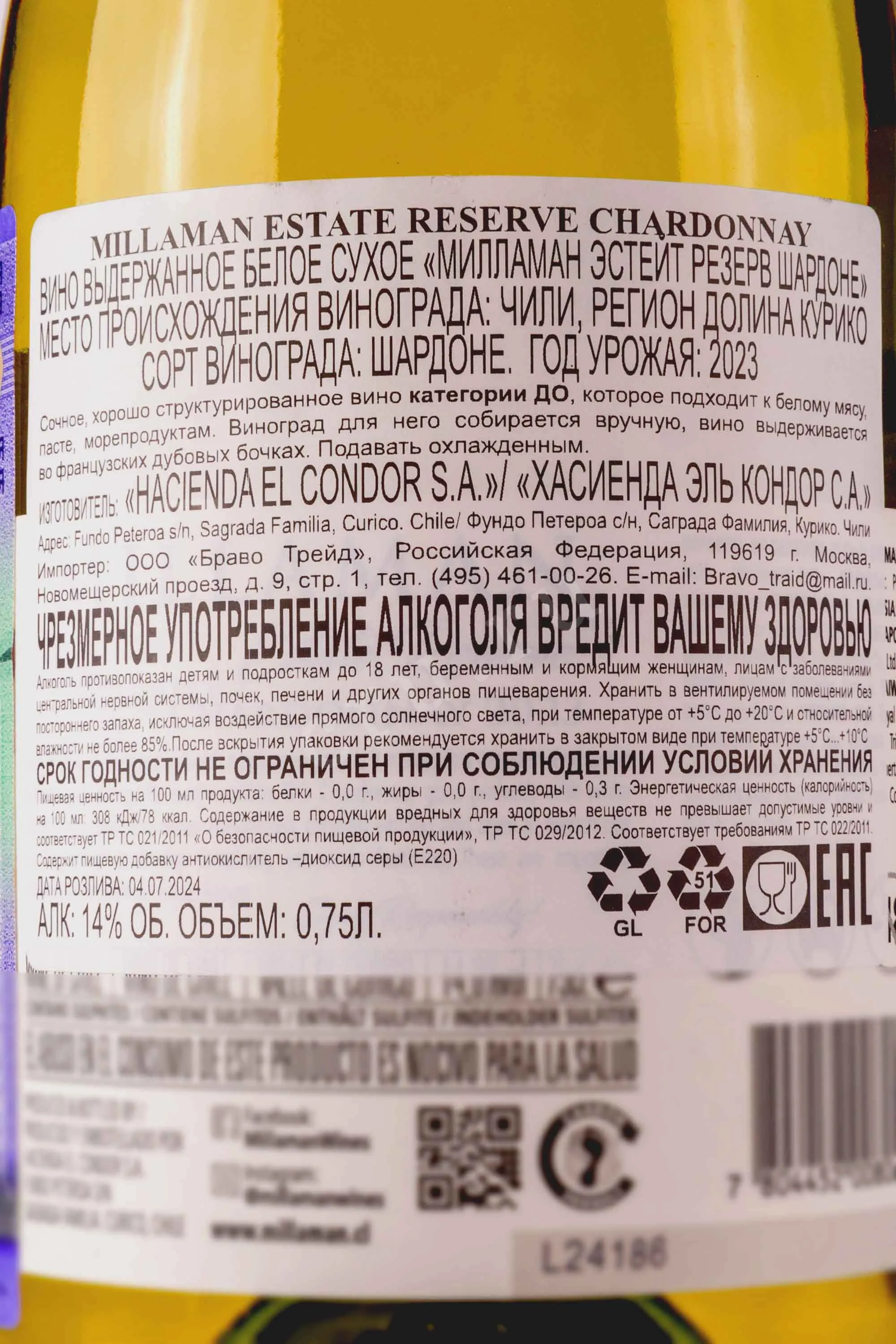Millaman Estate Reserve Chardonnay 0.75 л купить - Чилийское вино Милламан Эстейт Резерв Шардоне цена в магазинег. Москва, ул. Профсоюзная, д. 16/1010:00-22:00 Ежедневно+7 (495) 920-20-02info@cru.ru