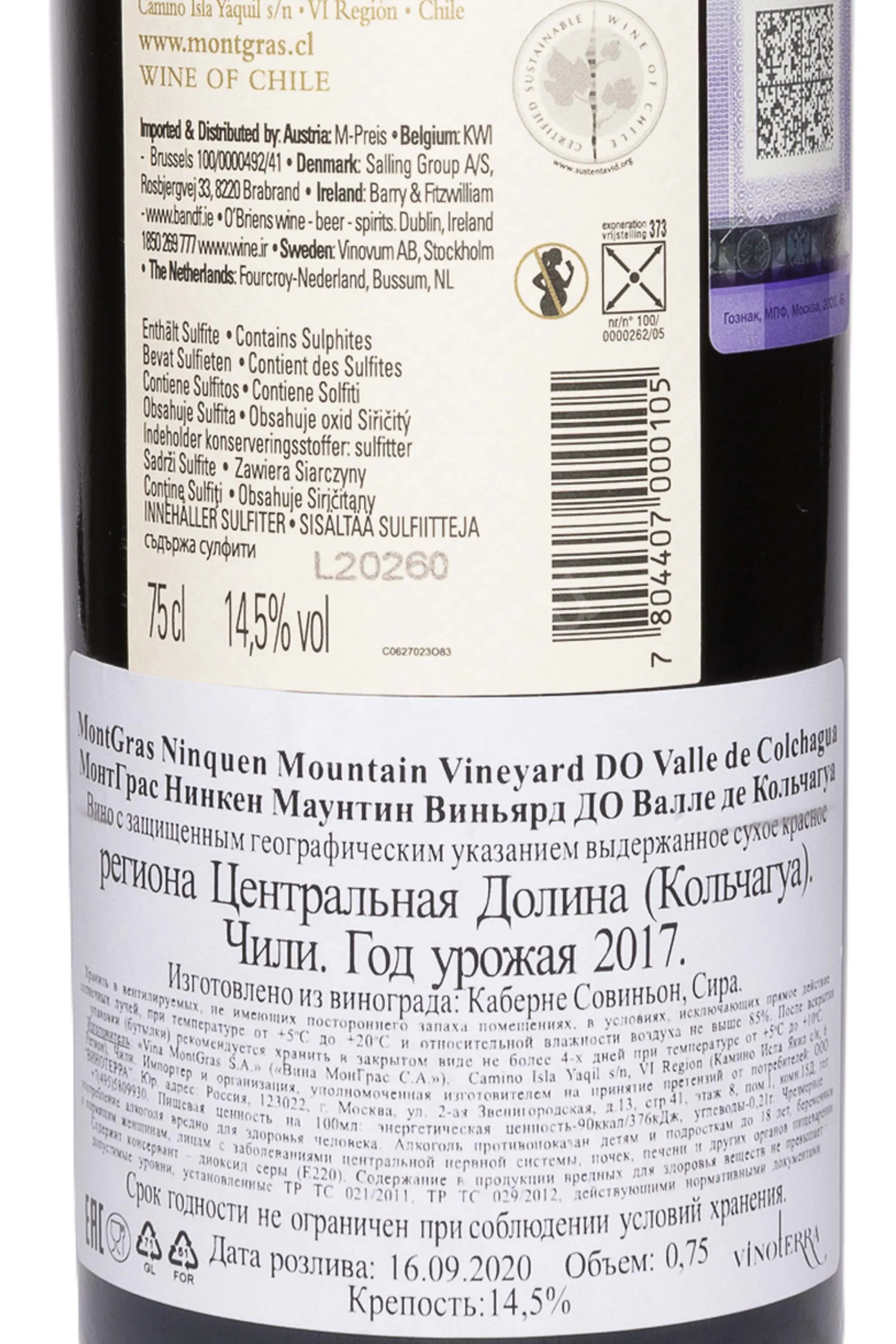 MontGras Ninquen Moutain Vineyard DO Valle del Colchagua 0.75 л купить - Чилийское вино МонтГрас Нинкен Маунтин Виньярд ДО Валле де Кольчагуа цена в магазине г. Москва, ул. Профсоюзная, д. 16/10 10:00-22:00 Ежедневно +7 (495) 920-20-02 info@cru.ru