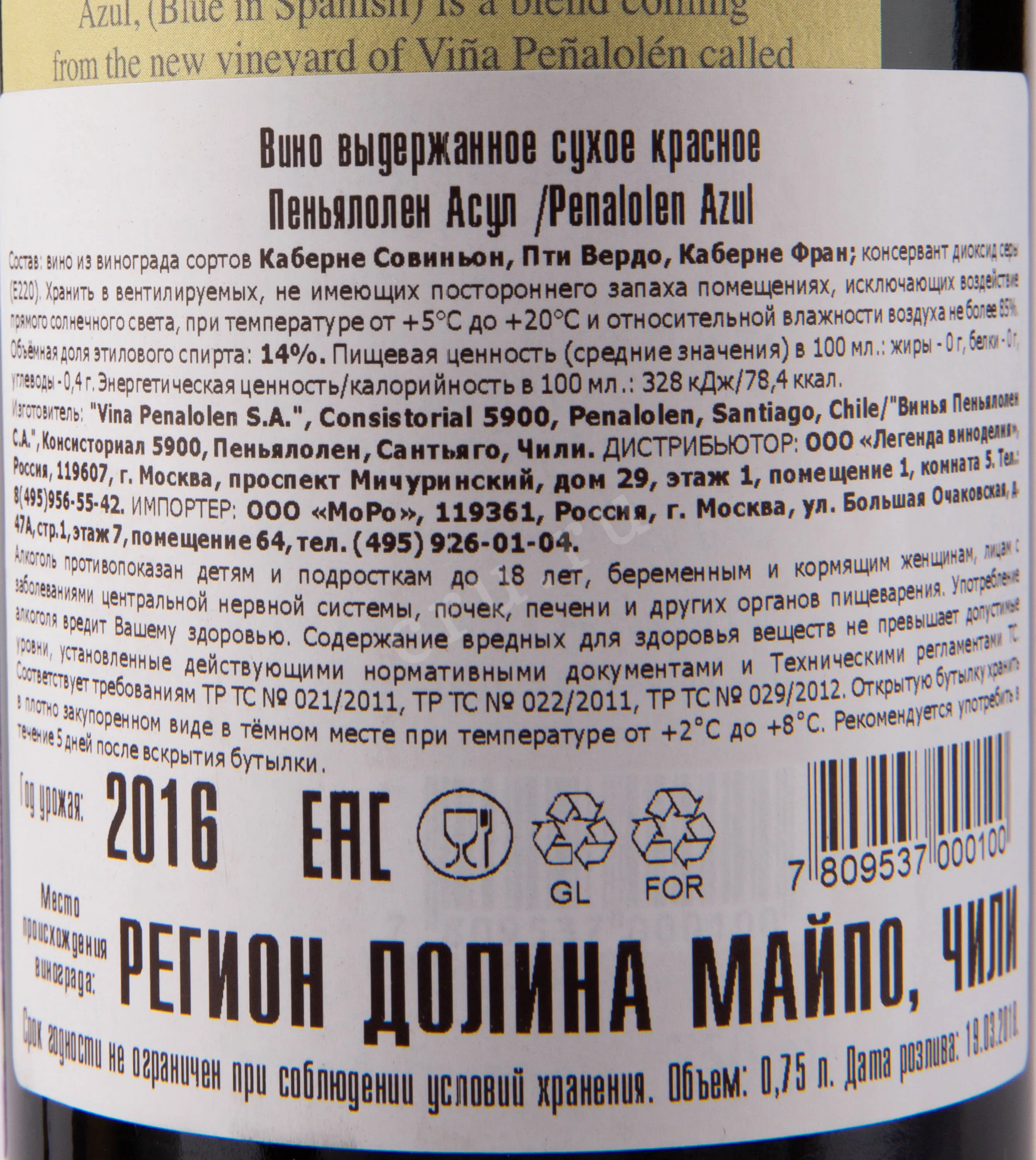 Penalolen Azul 0.75 л купить - Чилийское вино Пеньялолен Асул цена в магазине г. Москва, ул. Профсоюзная, д. 16/10 10:00-22:00 Ежедневно +7 (495) 920-20-02 info@cru.ru