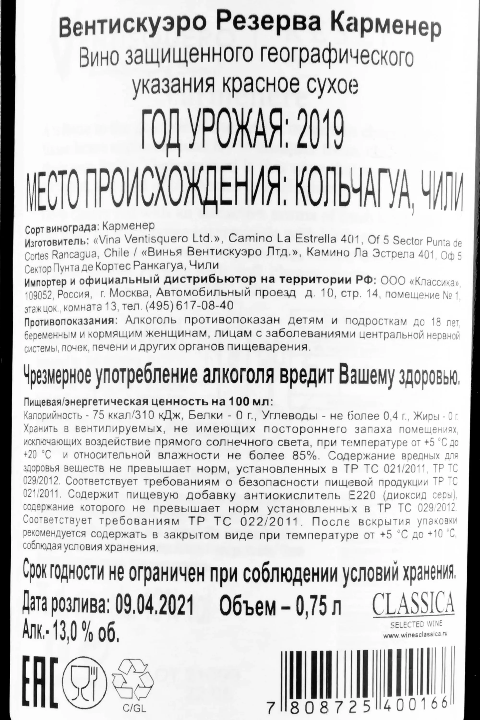 Вентискуэро Ресерва Карменере 2019 0.75