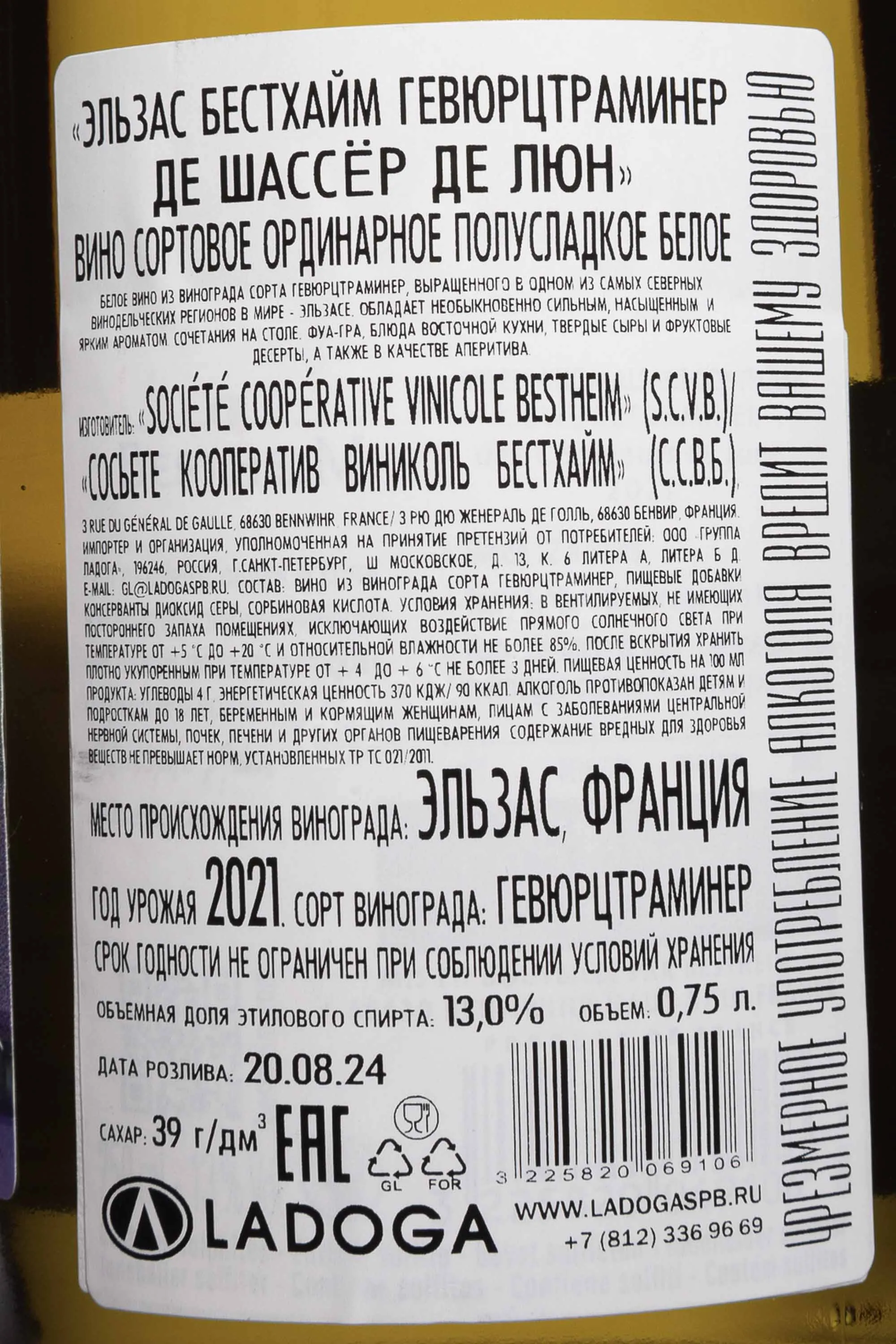 Белое полусладкое вино Alsace Bestheim Gewurztraminer des Chasseurs de Lune 2021 года 0,75 л создано в традиционной для Эльзаса ароматной и выразительной манере. Виноград выращен на холмистых участках региона с известково-глинистыми почвами, что придаёт ягодам плотность и пряный профиль. Сезон 2021 года был прохладным и неравномерным, но дал ароматный урожай с хорошей кислотностью, что стало плюсом для Гевюрцтраминера. Ферментация проходила в стальных резервуарах при контролируемой температуре. Выдержка на тонком осадке длилась около полугода. Малолактика не проводилась, что позволило сохранить чистую фруктовость и яркие специи в букете. Вино отмечено 91 баллом («неординарное») от James Suckling, что подтверждает его высокий уровень.