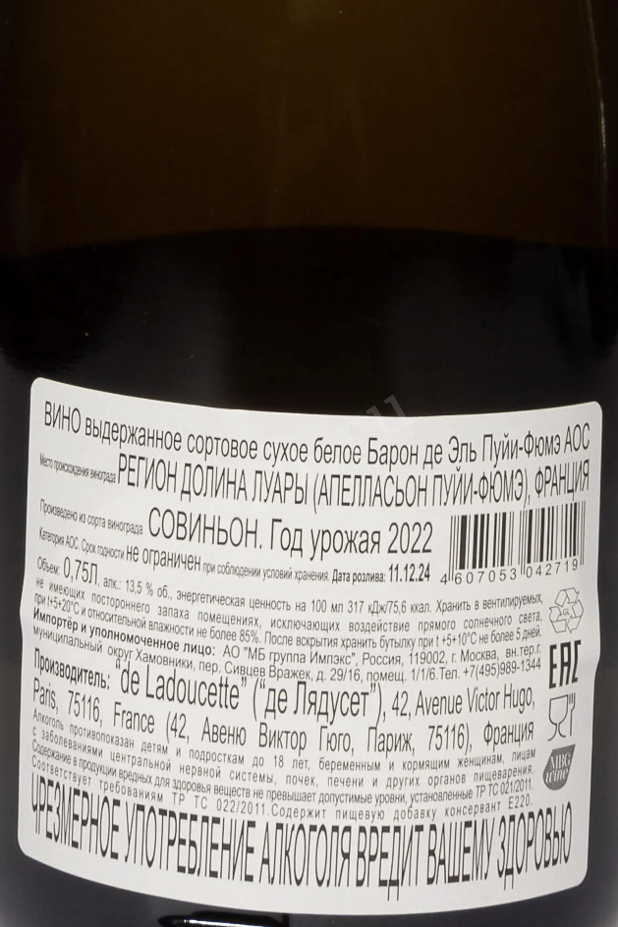 Белое сухое вино Baron de L Pouilly-Fume De Ladoucette 2022 года 0,75 л — подлинный образец изящества и благородства, одно из самых ярких творений барона де Лядусет. Его по праву называют драгоценностью. Для производства использовали сырье со старых лоз (старше 30 лет), растущих на крупнейших и лучших виноградниках Пуйи-Фюме. Виноград урожая 2022 года отличался зрелостью и гармоничной органолептикой благодаря теплому лету и мягкой осени. Для винификации использовался только сок первого отжима, полученного путем бережного прессования. Сусло из сырья с разных участков ферментировали отдельно. Выдержка на осадке протекала от 3 до 6 месяцев для разных партий. Затем купаж дозревал около 10 месяцев. Завершающим этапом стал пятимесячный «отдых» в бутылках, форма которых напоминает сосуды XIX века. Благодаря этой технологии вино медленно развивается, обретая сложный характер и большой потенциал. Пик зрелости винтажа 2022 года будет длиться 10 лет.