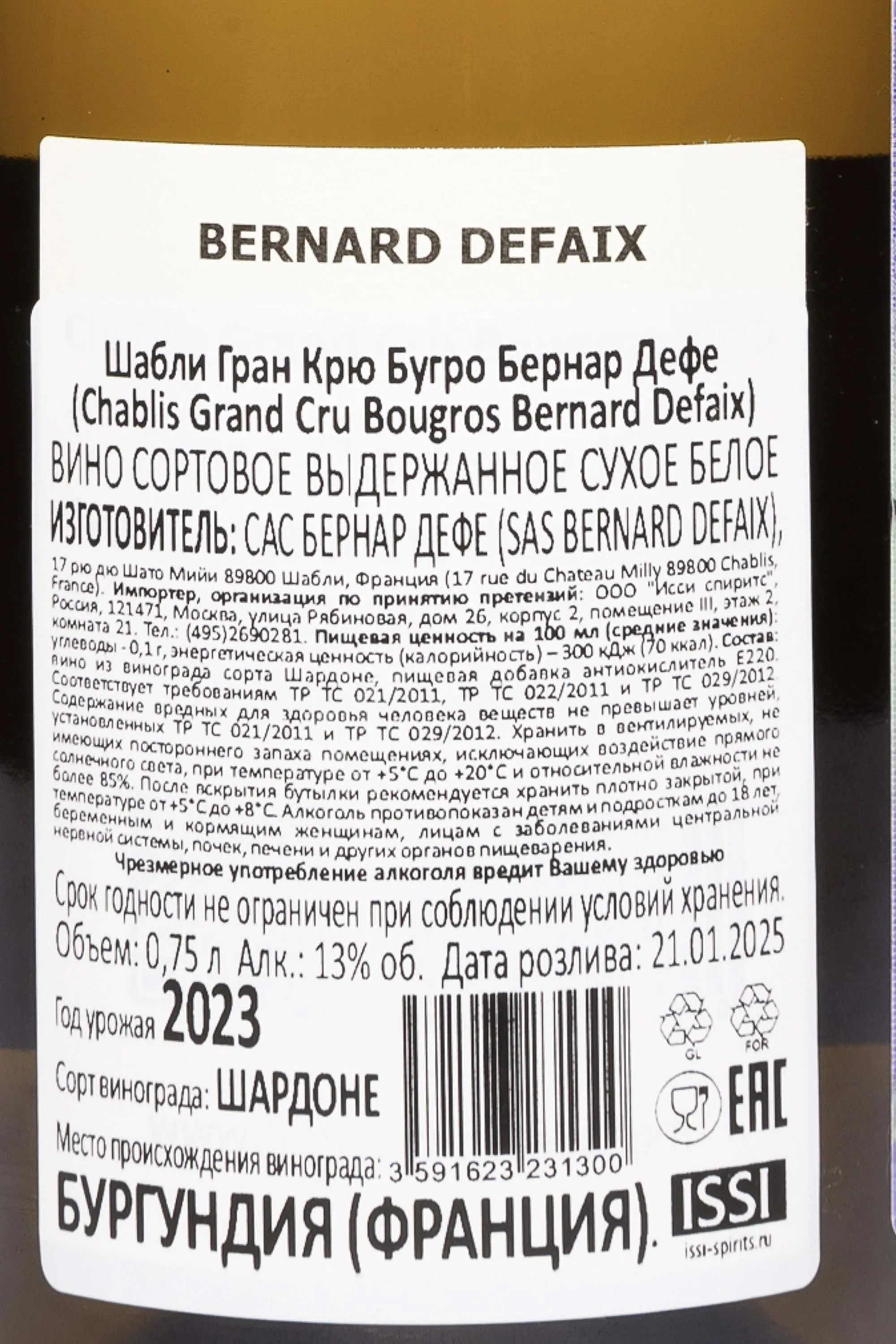 Белое сухое вино Bernard Defaix Chablis Grand Cru Bougros AOC 2023 года 0,75 л создано из винограда сорта Шардоне, собранного с лоз возрастом более тридцати лет. Виноградник Бугро находится на склонах с известково-глинистыми почвами, где в грунте встречаются древние морские окаменелости — они придают вину характерную минеральность. Урожай 2023 года в Шабли оказался удачным: умеренно тёплая весна и сухое лето позволили ягодам достичь идеального баланса кислотности и сахара. Винодельня Бернар Дефе придерживается экологического подхода, избегая химических удобрений и пестицидов. Брожение проходит на природных дрожжах, после чего вино выдерживается около десяти месяцев в нержавеющих резервуарах, чтобы сохранить чистоту аромата и свежесть вкуса. Это Шабли высоко ценится критиками за точность исполнения и типичное для Гран Крю выражение терруара.