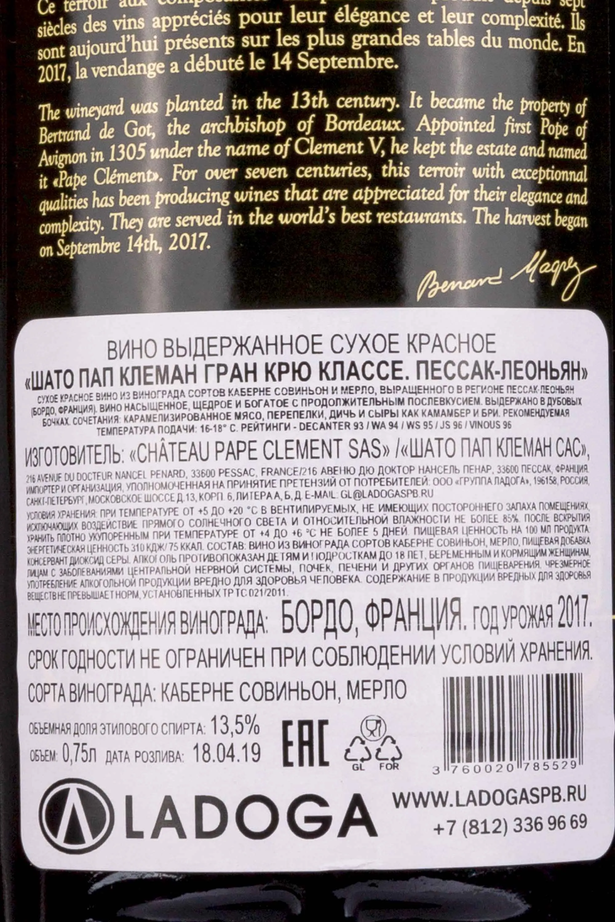 Бернар Магре Шато Пап Клеман Гран Крю Классе Пессак Леоньян 2017 0.75