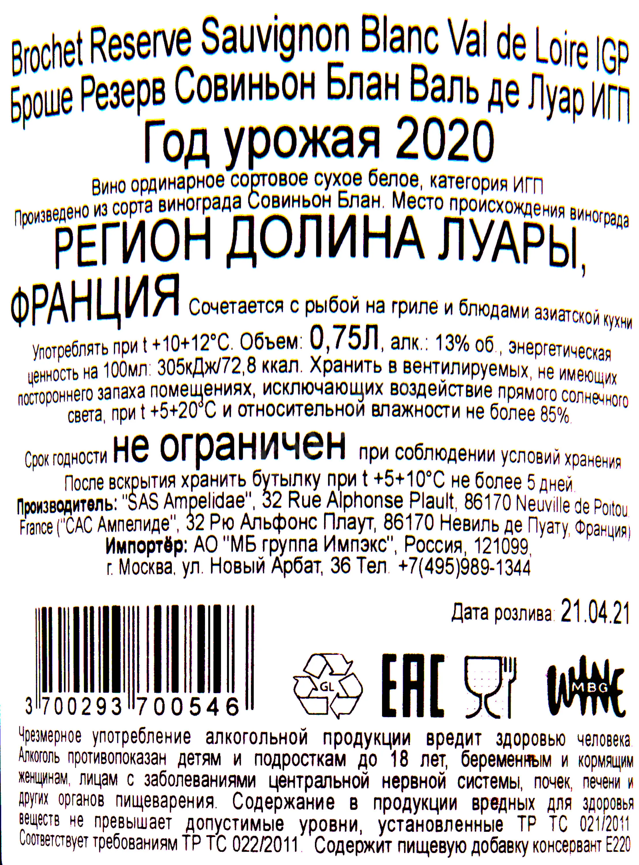 Brochet Sauvignon Blanc Reserve Val de Loire 0.75 л купить - Французское вино Броше Резерв Совиньон Блан Валь де Луар цена в магазинег. Москва, ул. Профсоюзная, д. 16/1010:00-22:00 Ежедневно+7 (495) 920-20-02info@cru.ru