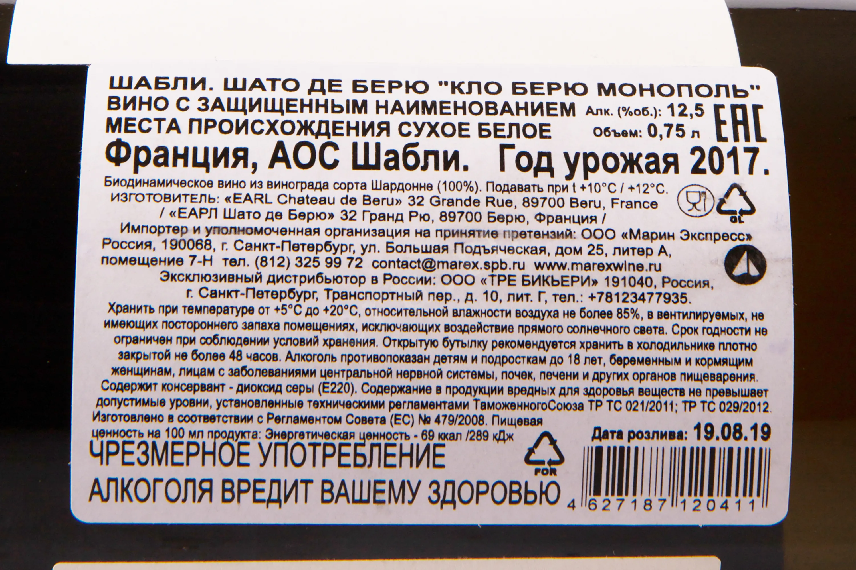 Шабли Шато де Берю Кло Берю Монополь 2017 0.75