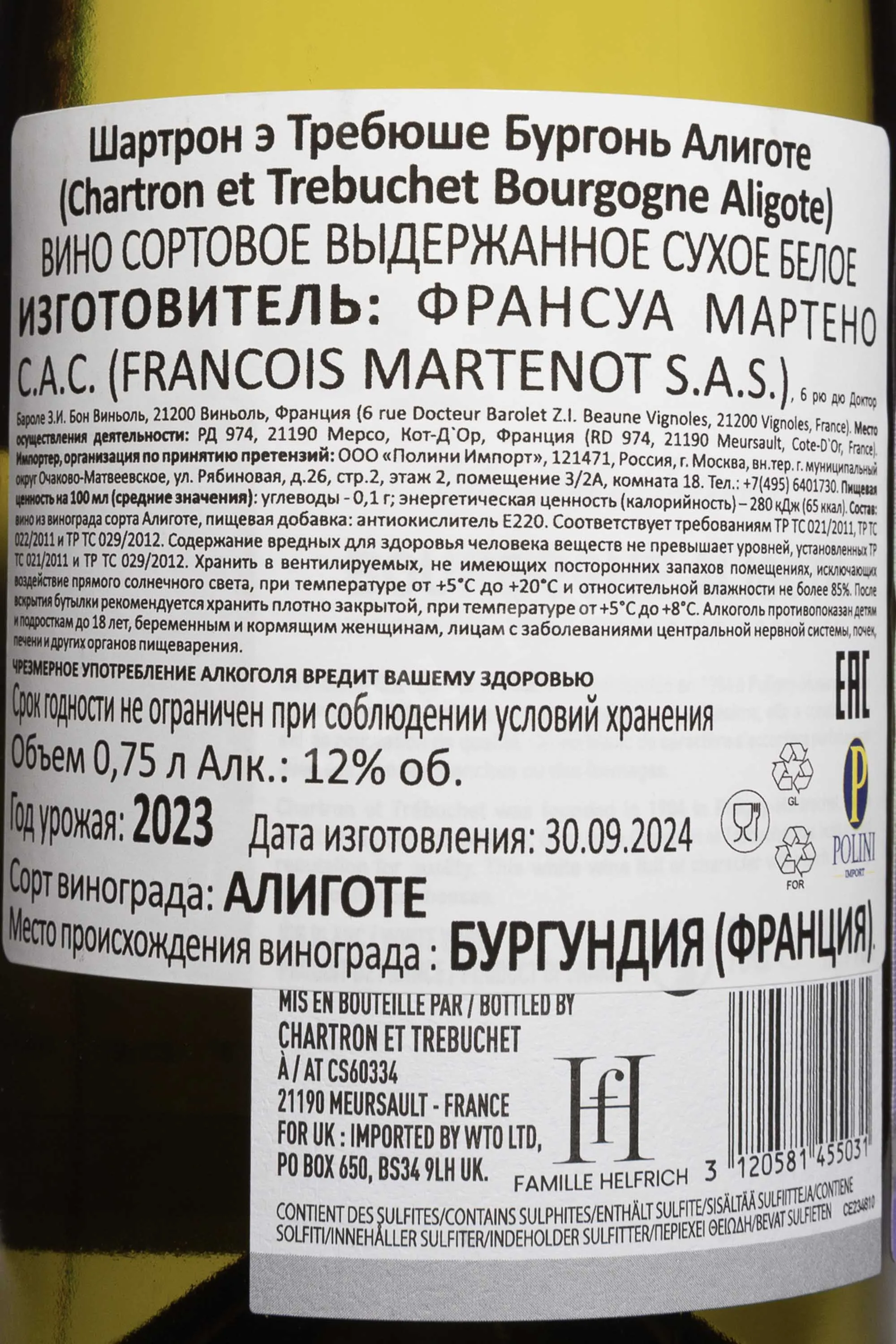Белое сухое вино Chartron et Trebuchet Bourgogne Aligote AOC 2023 г. 0,75 л — классический пример бургундского белого сорта в сдержанном и точном исполнении. Дом работает в Бургундии с конца XX века и известен вниманием к происхождению винограда и чистоте стиля. Для винификации используют плоды из разных зон региона, что позволяет сохранить типичный характер апелласьона. Сырьё выращено на известняковых и глинисто-известняковых почвах, которые формируют свежий и прямолинейный профиль. Винификация проходила при контролируемых температурах в стальных чанах, чтобы подчеркнуть природную кислотность и сохранить первичную выразительность сорта. Выдержка — непродолжительная, тоже в стали.