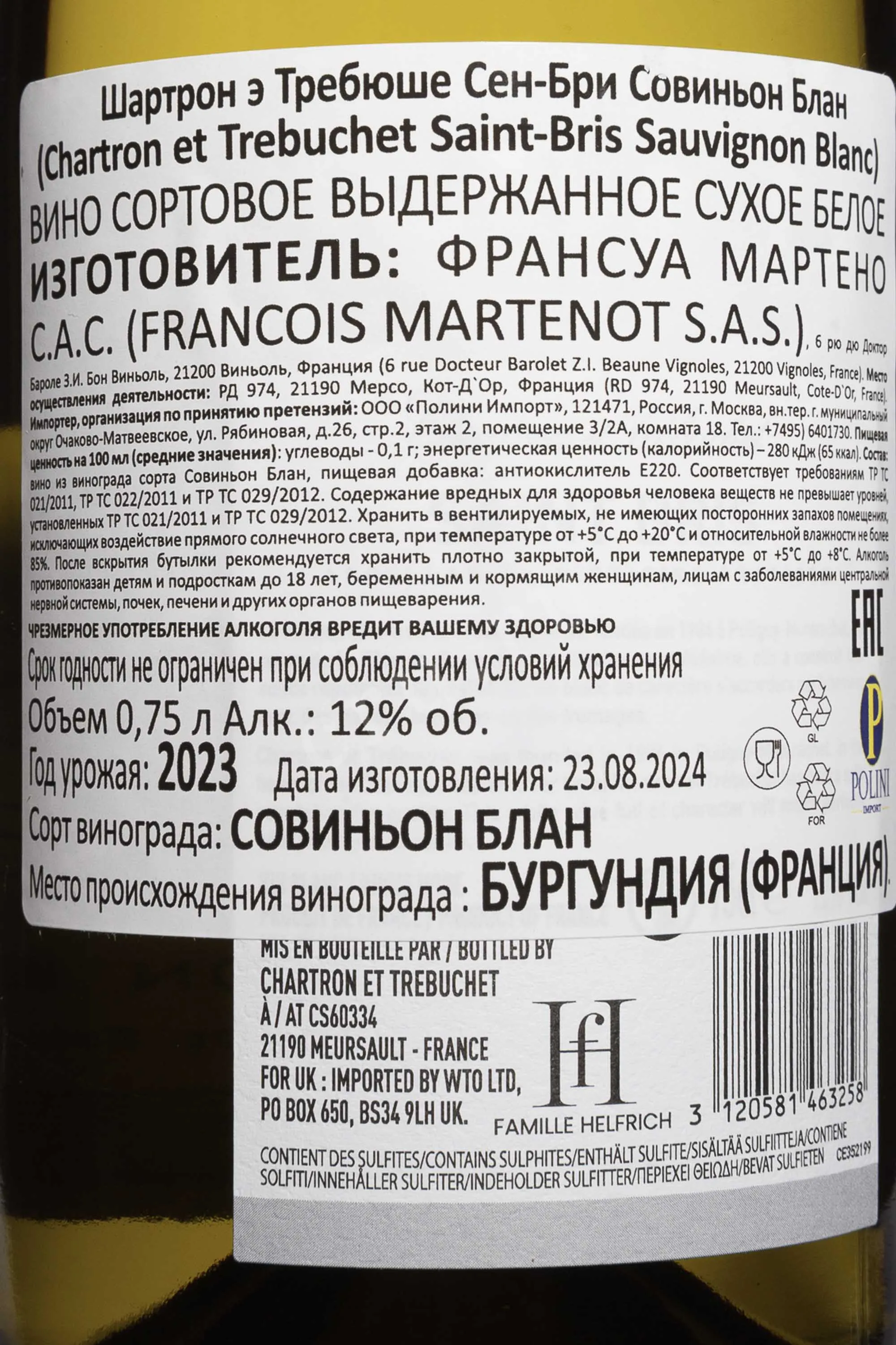 Белое сухое вино Chartron et Trebuchet Sauvignon Blanc Saint-Bris AOC 2023 г. 0,75 л — редкий для Бургундии пример Совиньон Блан с отчетливой региональной идентичностью. Апелласьон расположен на севере региона, недалеко от Шабли, и является единственным в Бургундии, где официально разрешен этот сорт. Виноград выращивается на известняковых и киммериджских почвах, которые формируют прямой и минеральный характер плодов. Сбор проводится при оптимальной зрелости, чтобы сохранить баланс между кислотностью и ароматической выразительностью. Винификация проходит в стальных емкостях с контролем температуры. Краткая выдержка без использования дуба позволяет сохранить природный характер сорта и подчеркнуть терруар.