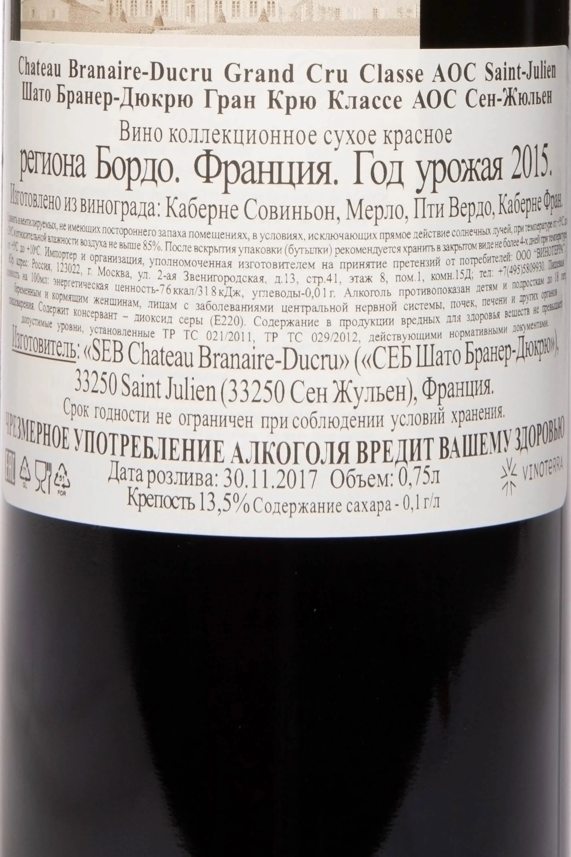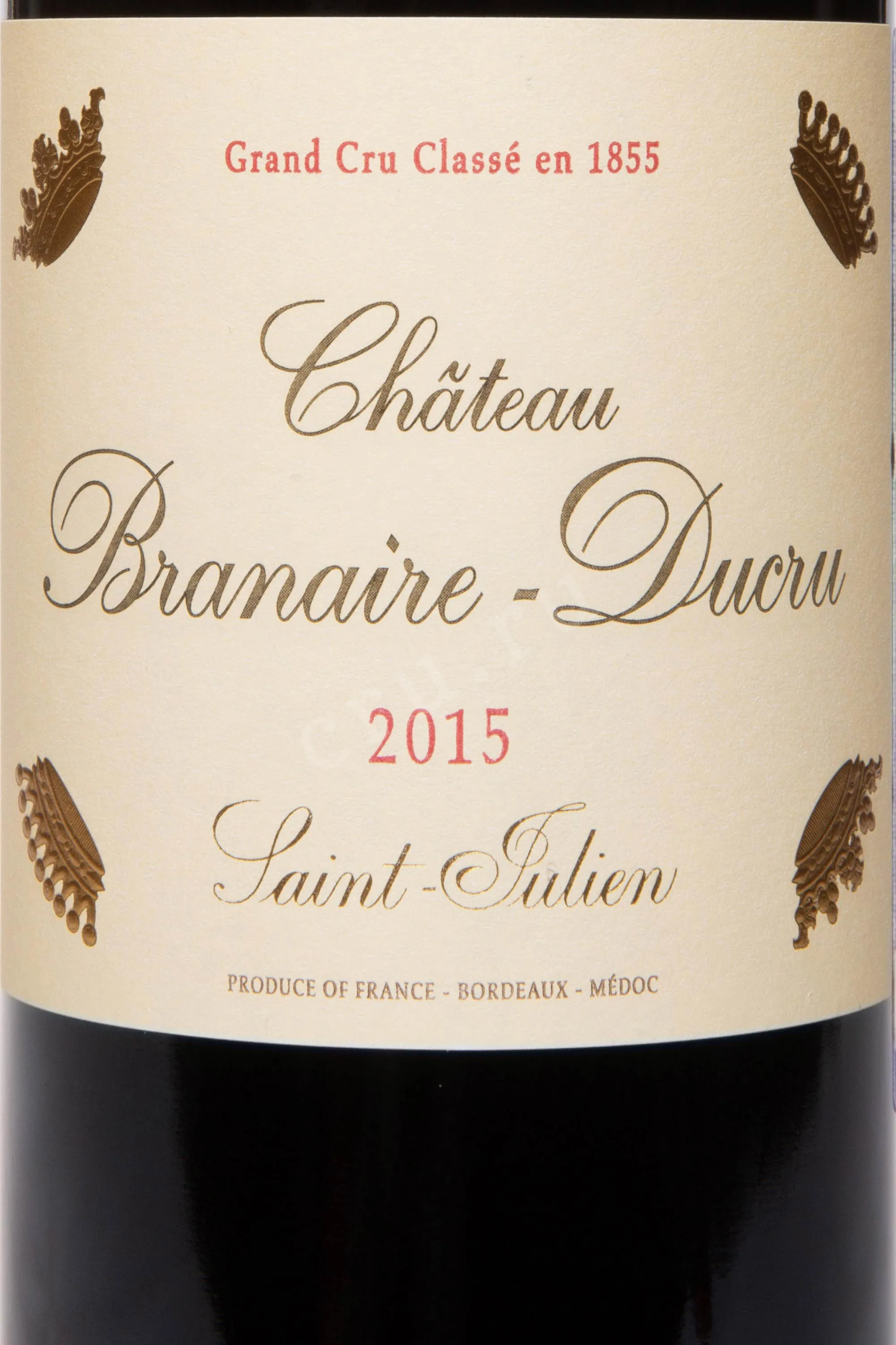 Chateau Branaire Ducru Grand Cru Classe Saint-Julien AOC 2015 — образец левобережного Бордо, сформированный на гравийных почвах плато Бейшевель в апелласьоне Сен-Жюльен, где каменистый терруар с глубокими глинистыми слоями обеспечивал лозам устойчивость к засухе и концентрацию вкуса. Урожай 2015 года был собран с лоз среднего возраста 35–40 лет и винифицирован с контролем температур, после чего ассамбляж (65% Каберне Совиньон, 26% Мерло, 5% Пти Вердо, 4% Каберне Фран) выдерживался 18–20 месяцев во французских дубовых барриках, около 60% которых были новыми. Это позволило сформировать сложную структуру и подчеркнуть потенциал выдержки, отразив обновлённый стиль хозяйства, сформировавшийся после модернизации в конце XX века.