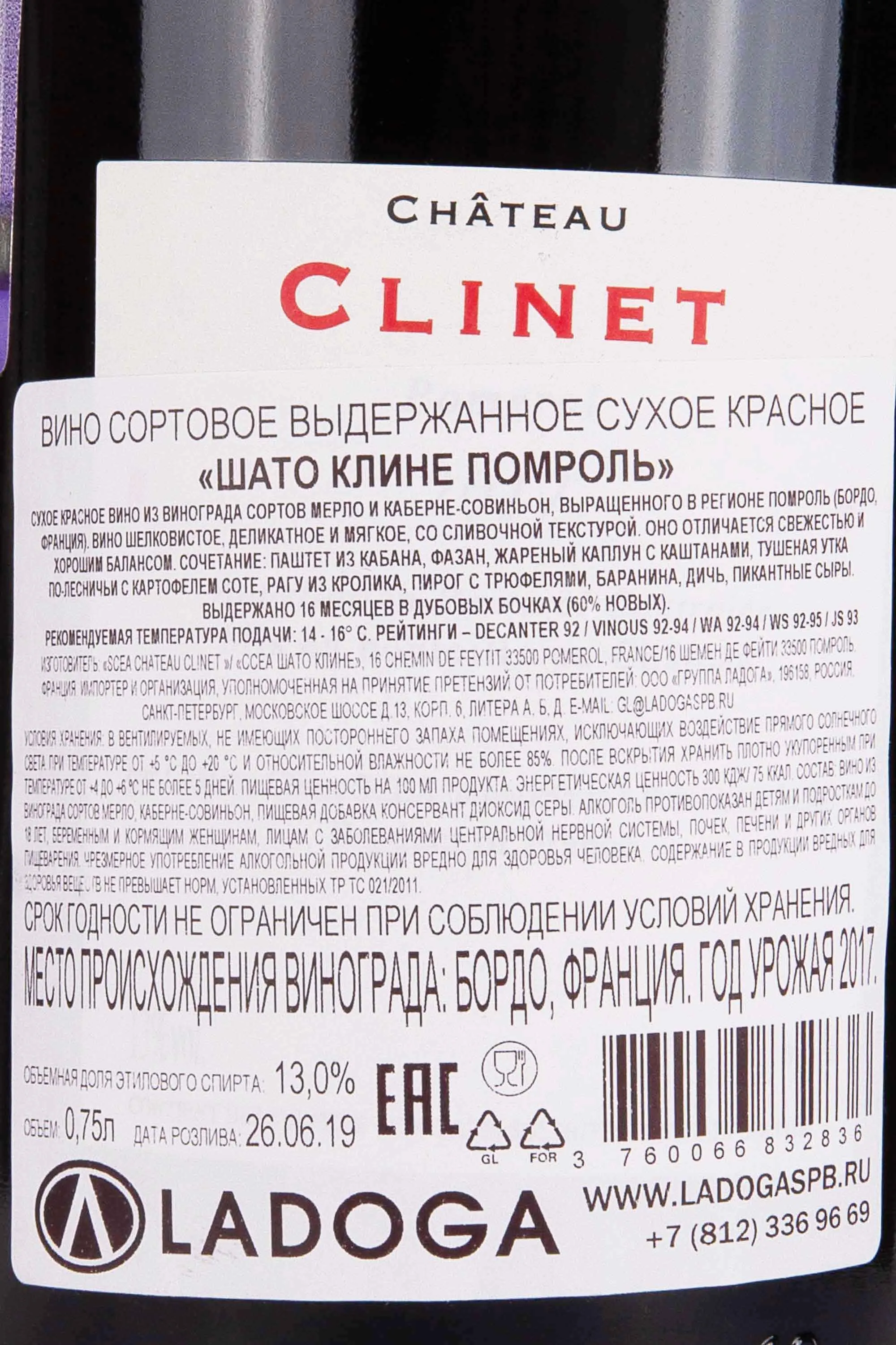 Chateau Clinet Pomerol 2017 0.75 л купить - Французское вино Шато Клине Помроль цена в магазине г. Москва, ул. Профсоюзная, д. 16/10 10:00-22:00 Ежедневно +7 (495) 920-20-02 info@cru.ru