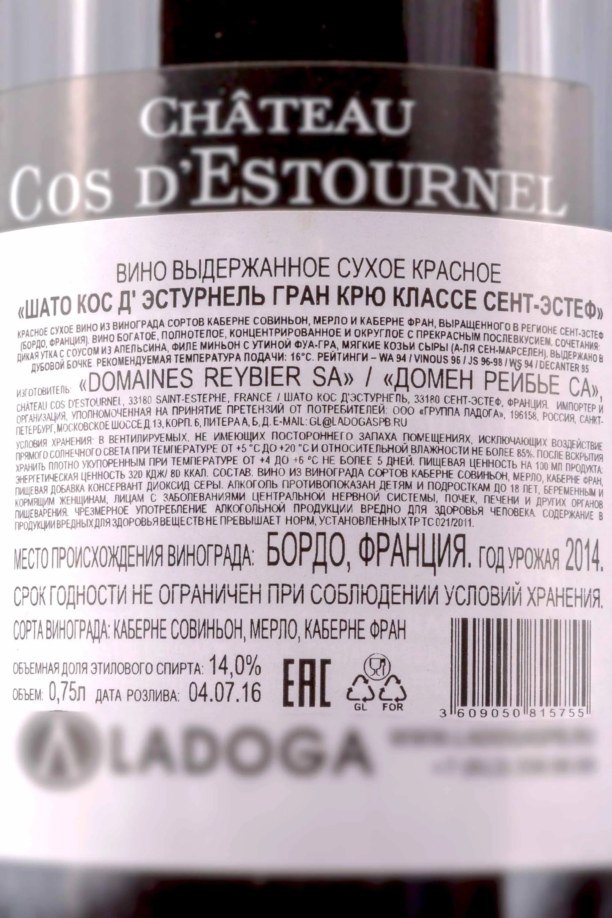Шато Кос д Эстурнель Гран Крю Классе Сент-Эстеф 2014 0.75