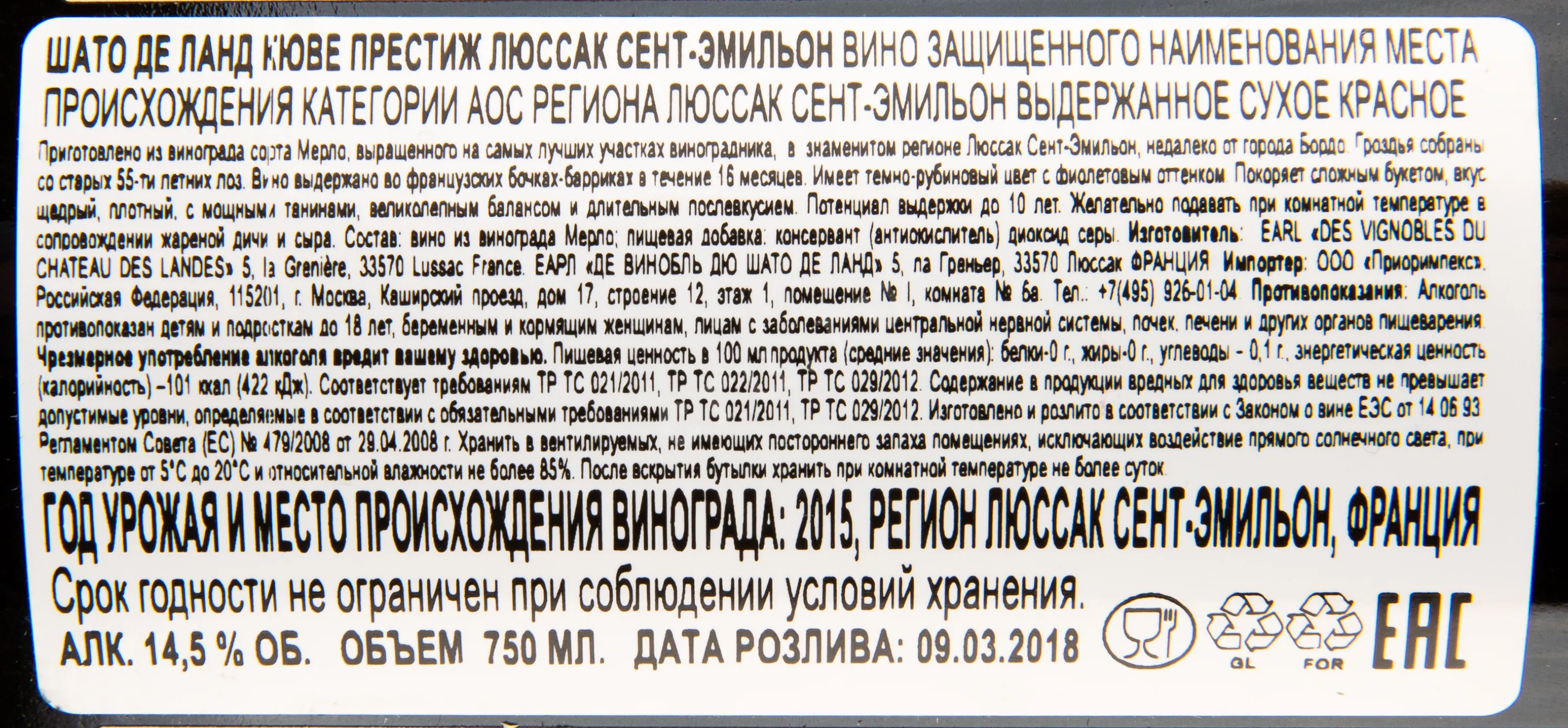 Шато де Ланд Кюве Престиж Люссак Сент Эмильон 2015 0.75
