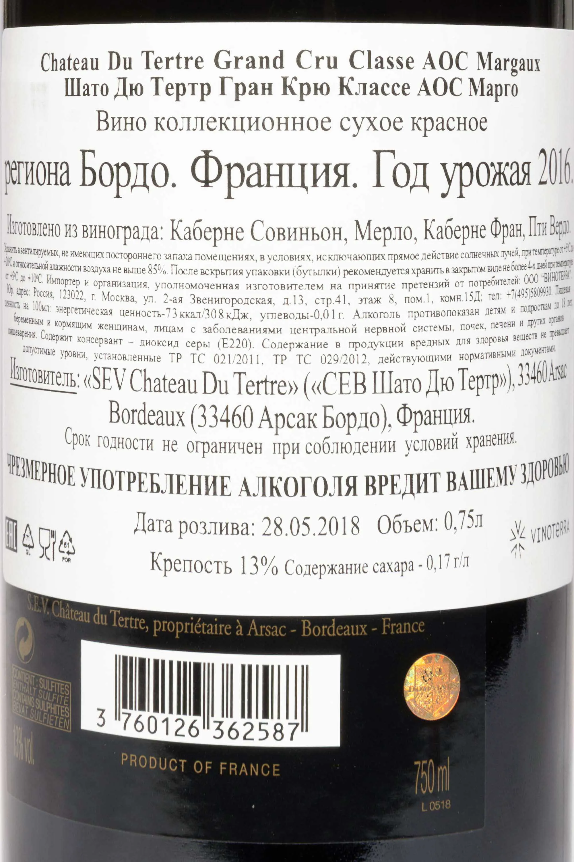 Красное сухое вино Chateau du Tertre Grand Cru Classe Margaux AOC 2016 г. 0,75 л создано в историческом шато, известном еще с XVIII века. Виноградники его расположены на возвышенностях апеласьона Марго, где почвы состоят из гравия с примесью песка и известняка. Такое сочетание обеспечивает дренаж и накопление тепла, что помогает ягодам достигать оптимальной зрелости. Урожай оказался одним из лучших в своем десятилетии: весна была прохладной и дождливой, но лето и осень принесли теплые и сухие дни с прохладными ночами. Благодаря этому ягоды сохранили кислотность при высокой концентрации сахаров и фенольных соединений. Напиток провел в дубовых бочках не менее 12 месяцев, что придало ему сложность и гармоничную структуру.