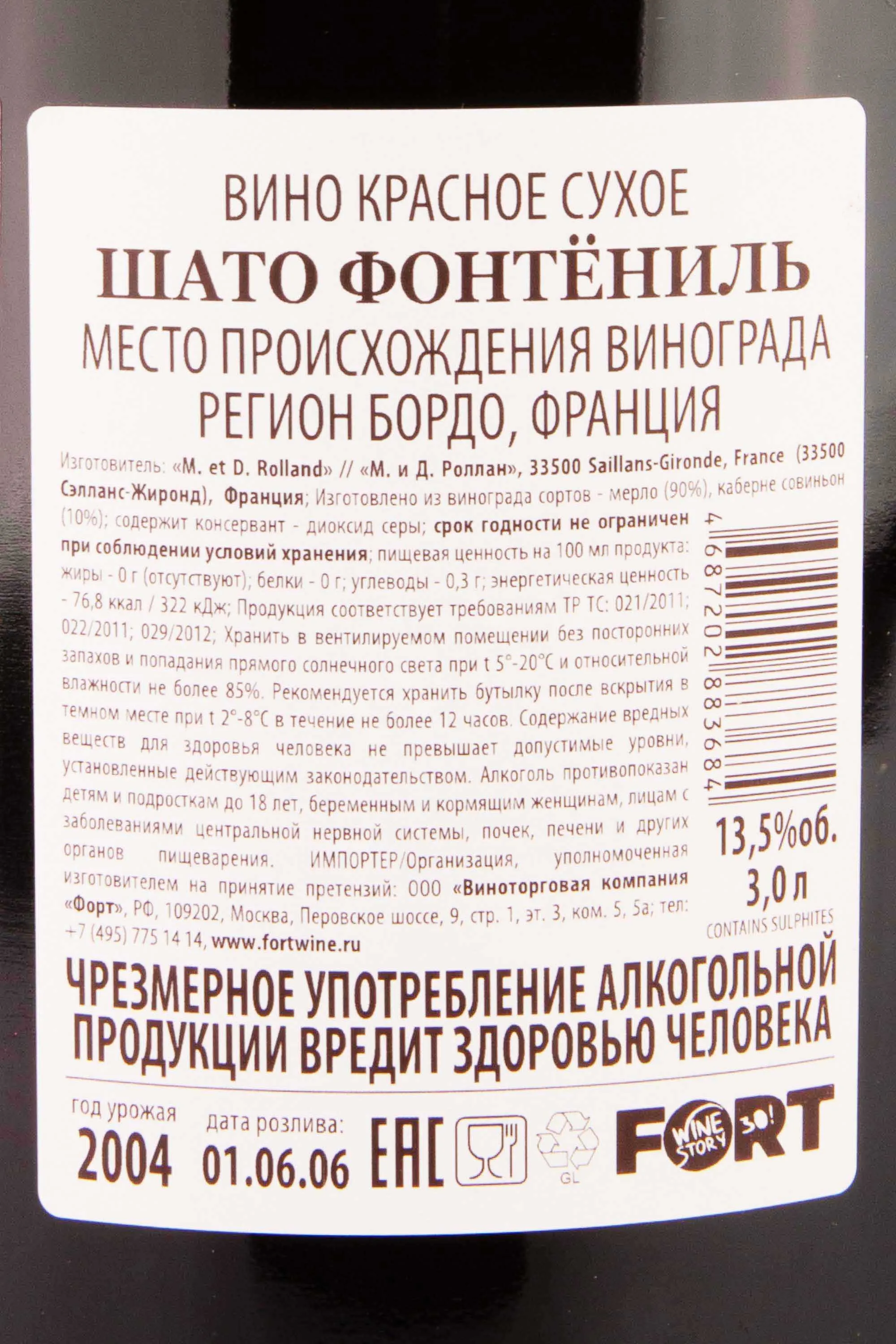 Chateau Fontenil Rolland Collection 2004 3 л купить - Французское вино Шато Фонтёниль Роллан Коллекция цена в магазине г. Москва, ул. Профсоюзная, д. 16/10 10:00-22:00 Ежедневно +7 (495) 920-20-02 info@cru.ru