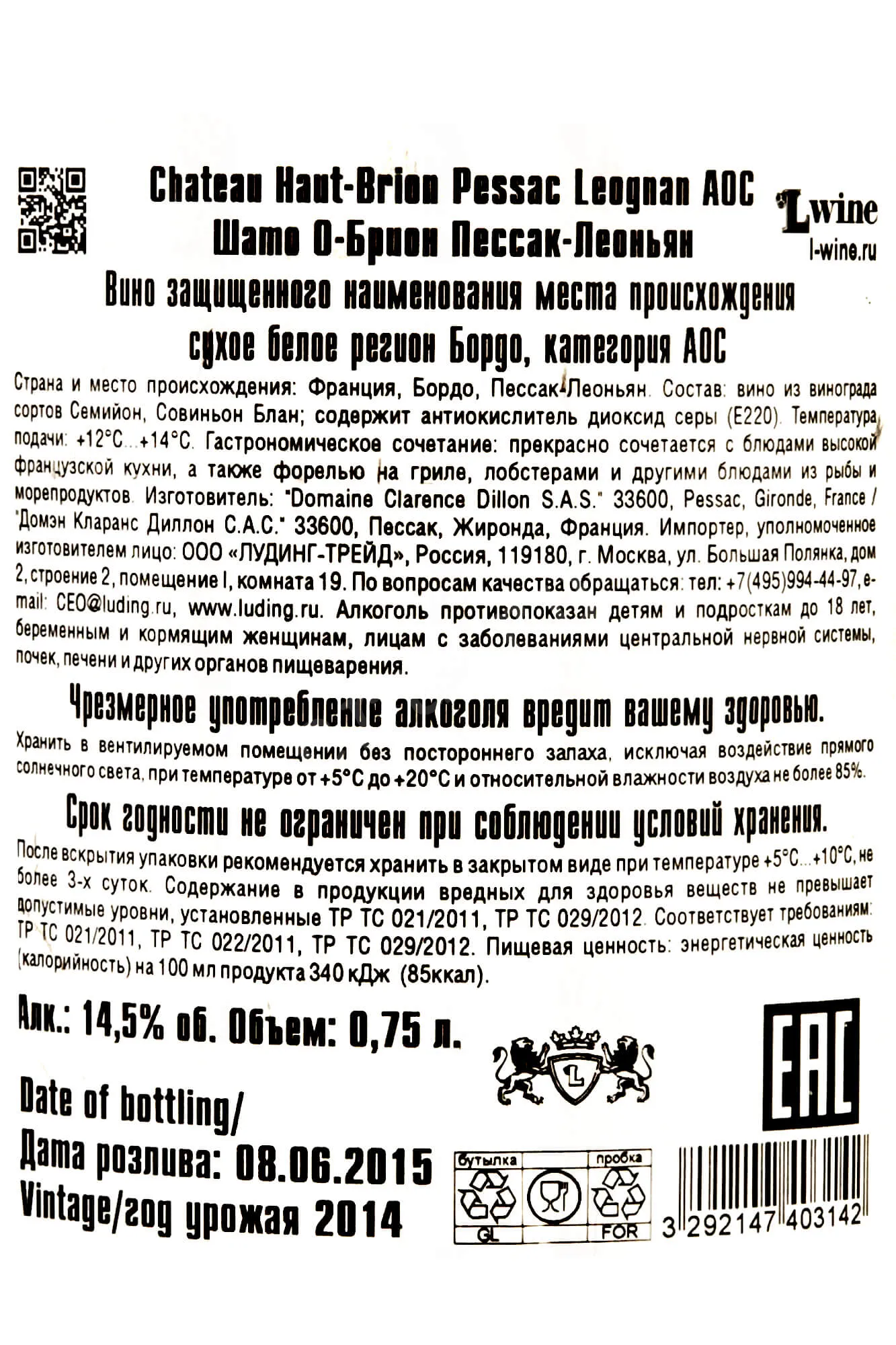 Шато О-Брион Блан Пессак-Леоньян АОС 2014 0.75