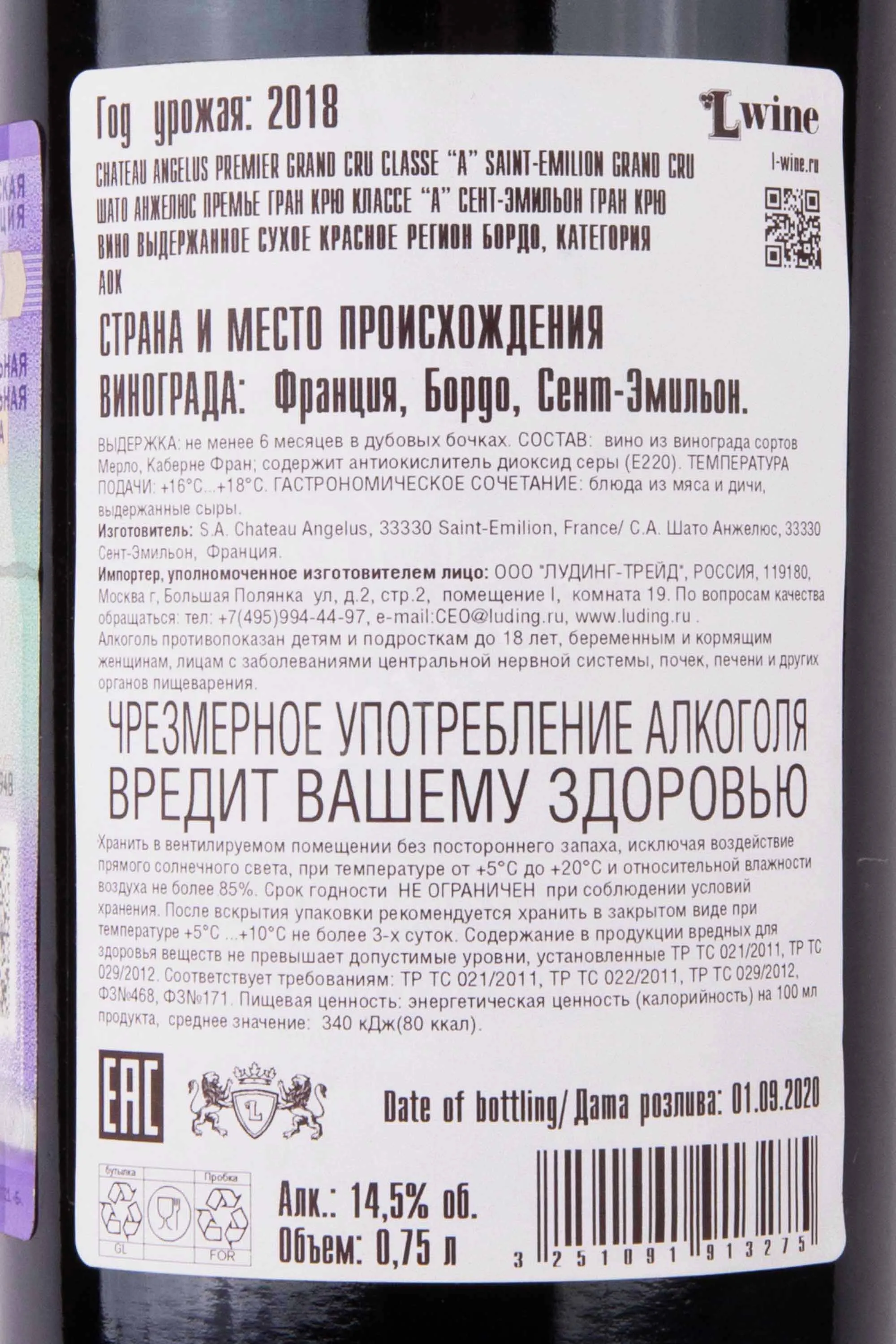 Вино Chateau l'Angelus Saint-Emilion AOC 1-er Grand Cru Classe 2018 0.75 л