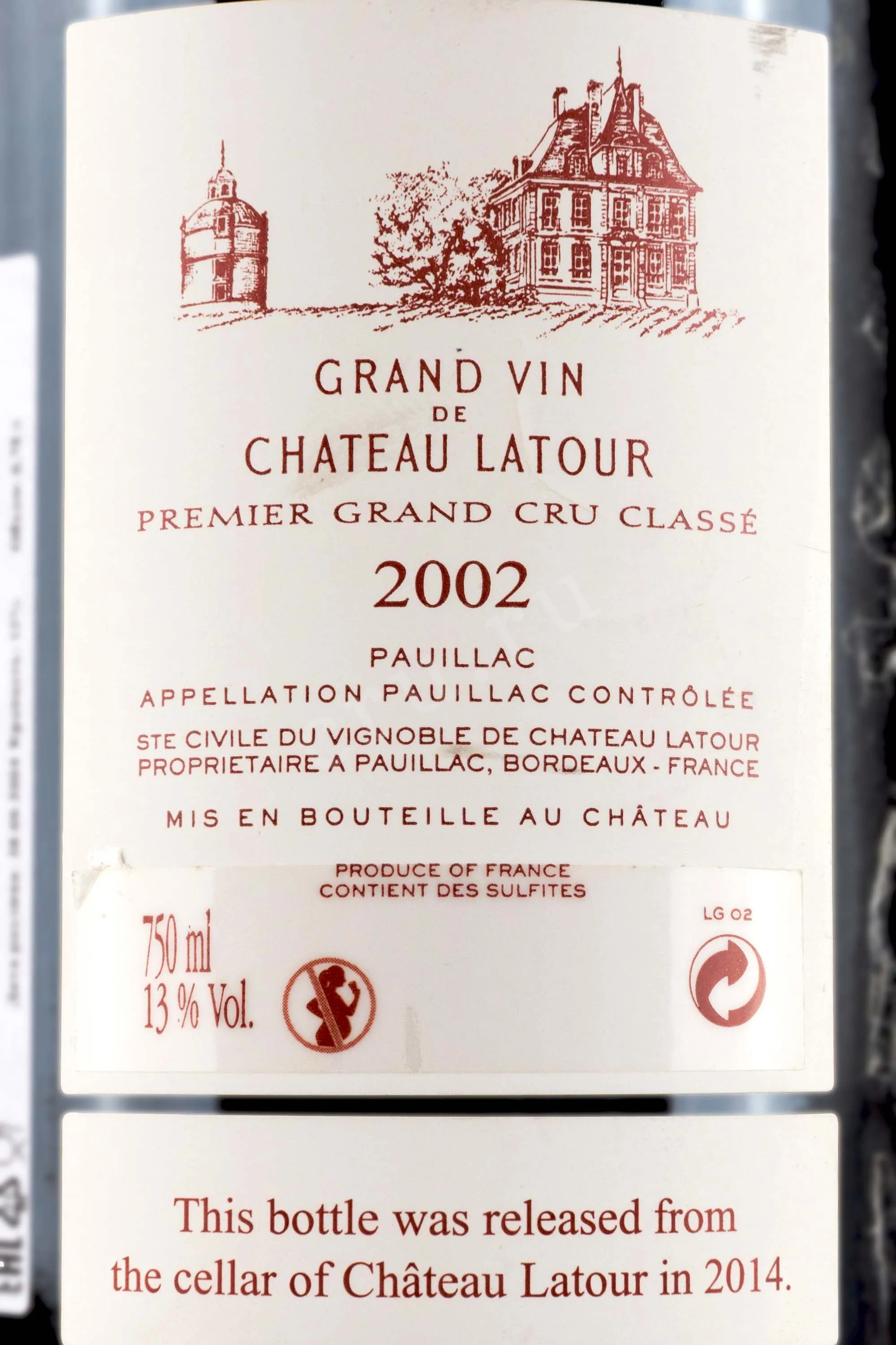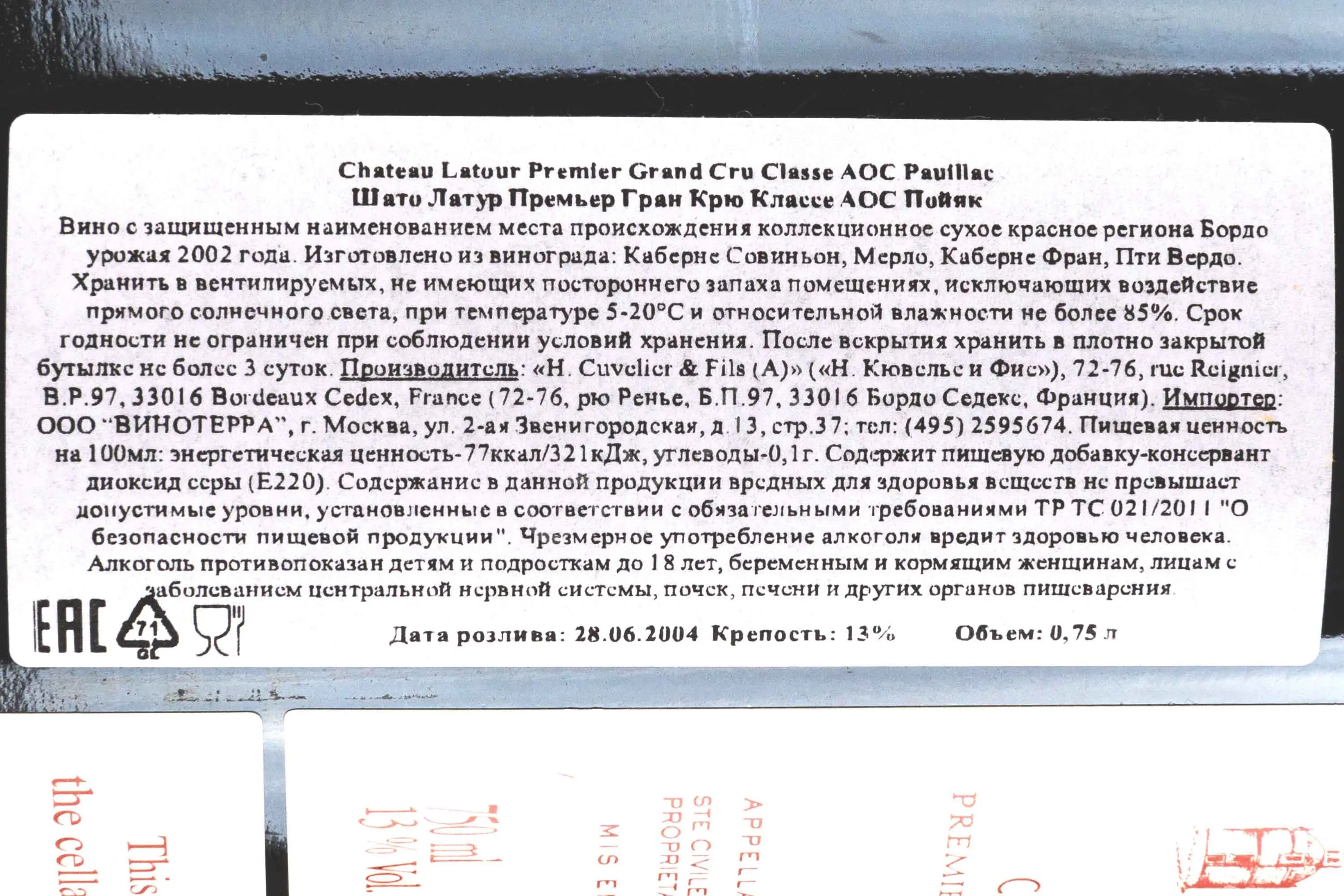 Chateau Latour 1-er Grand Cru Classe Pauillac 2002 0.75 л купить - Французское вино Шато Латур Премье Гран Крю Классе Пойяк цена в магазине г. Москва, ул. Профсоюзная, д. 16/10 10:00-22:00 Ежедневно +7 (495) 920-20-02 info@cru.ru