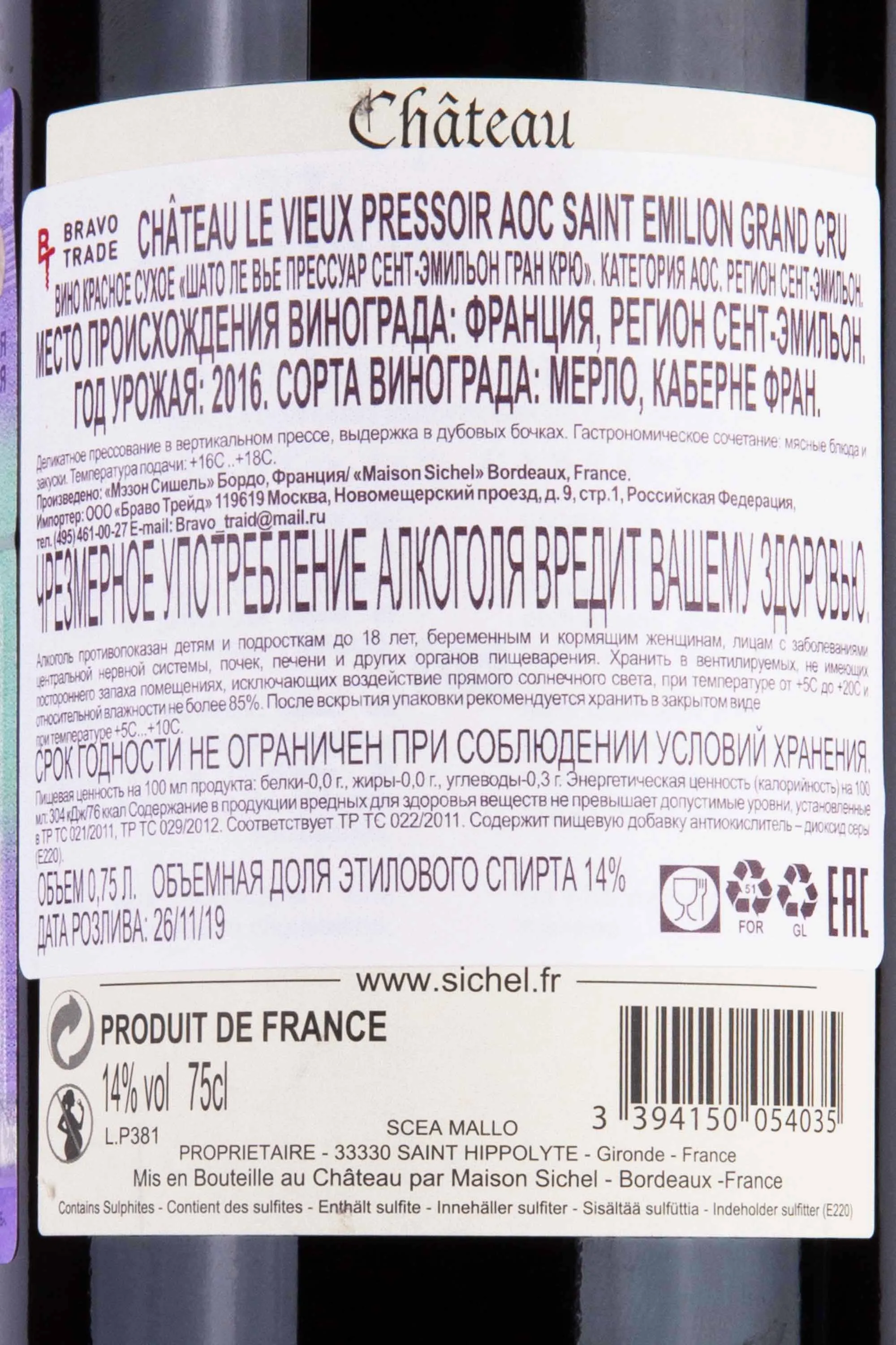 Шато Ле Вье Прессуар Сент-Эмильон Гран Крю 2016 0.75