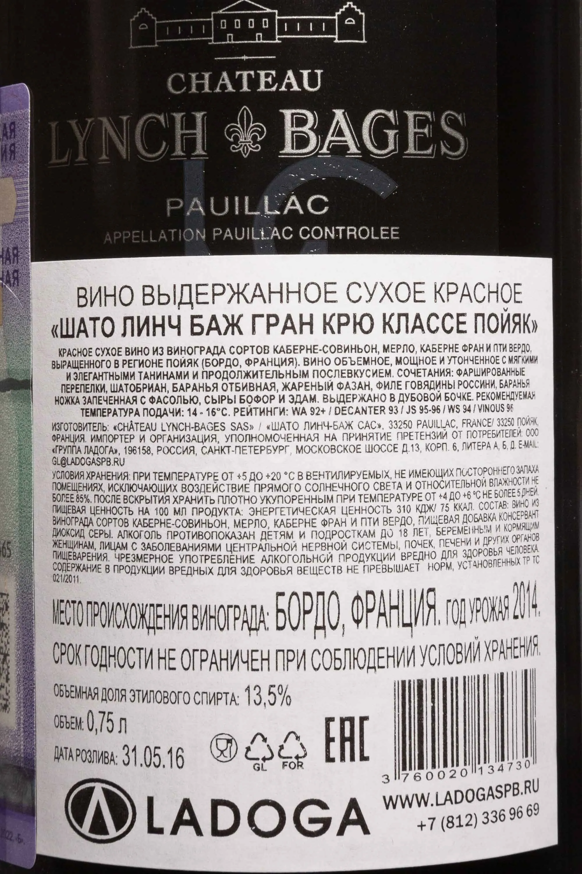 Вино Chateau Lynch Bages Pauillac Grand Cru Classe 2014 0.75 l – это качественный французский алкоголь, созданный из урожая одного года. Напиток отличается прекрасным балансом силы, свежести и элегантности и даже бал назван одним из самых лучших в регионе Пойяк. Основой вина является спелый виноград, собранный механическим способом. Алкоголь выдерживался в течение 18 месяцев в дубовых бочках, 75% — из новой древесины. Готовое красное сухое вино было бутилировано при крепости 13.5% и имеет потенциал хранения до 25 лет.