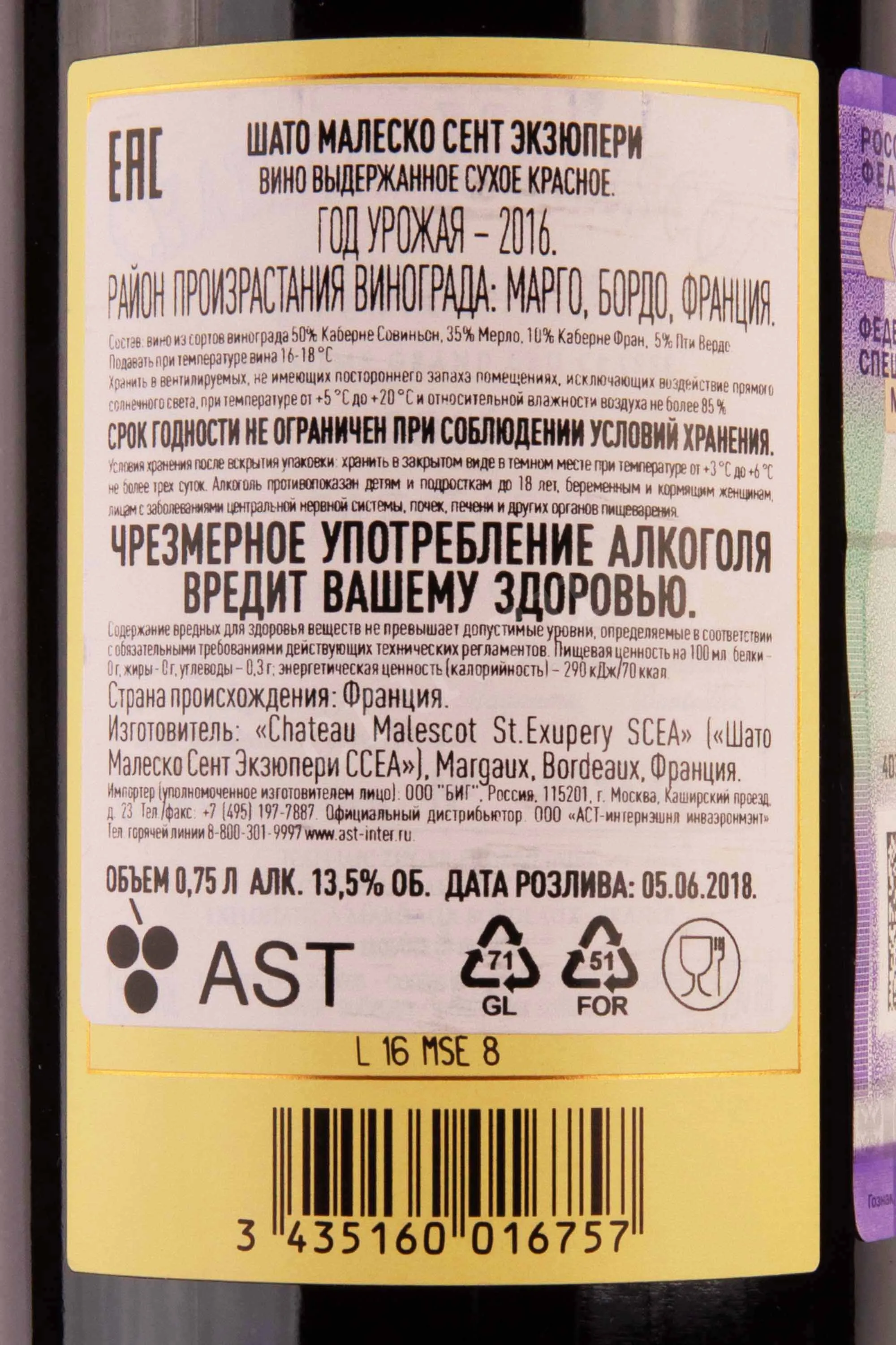 Chateau Malescot Saint Exupery 2016 0.75 л купить - Французское вино Шато Малеско Сент Экзюпери цена в магазине г. Москва, ул. Профсоюзная, д. 16/10 10:00-22:00 Ежедневно +7 (495) 920-20-02 info@cru.ru