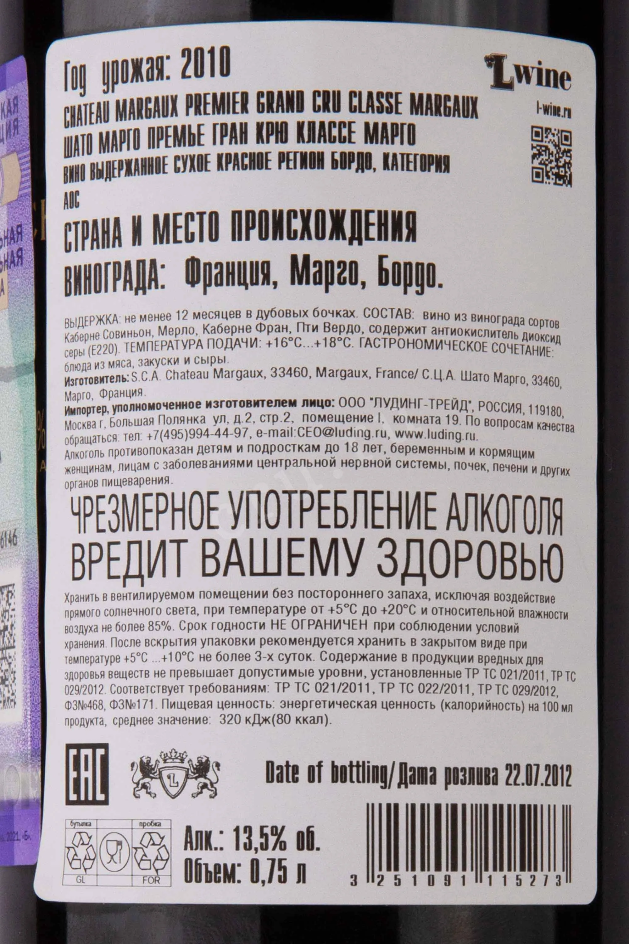 Chateau Margaux 1er Grand Cru Classe Margaux 2010 0.75 л купить - Французское вино Шато Марго Премье Гранд Крю Классе Марго цена в магазине г. Москва, ул. Профсоюзная, д. 16/10 10:00-22:00 Ежедневно +7 (495) 920-20-02 info@cru.ru