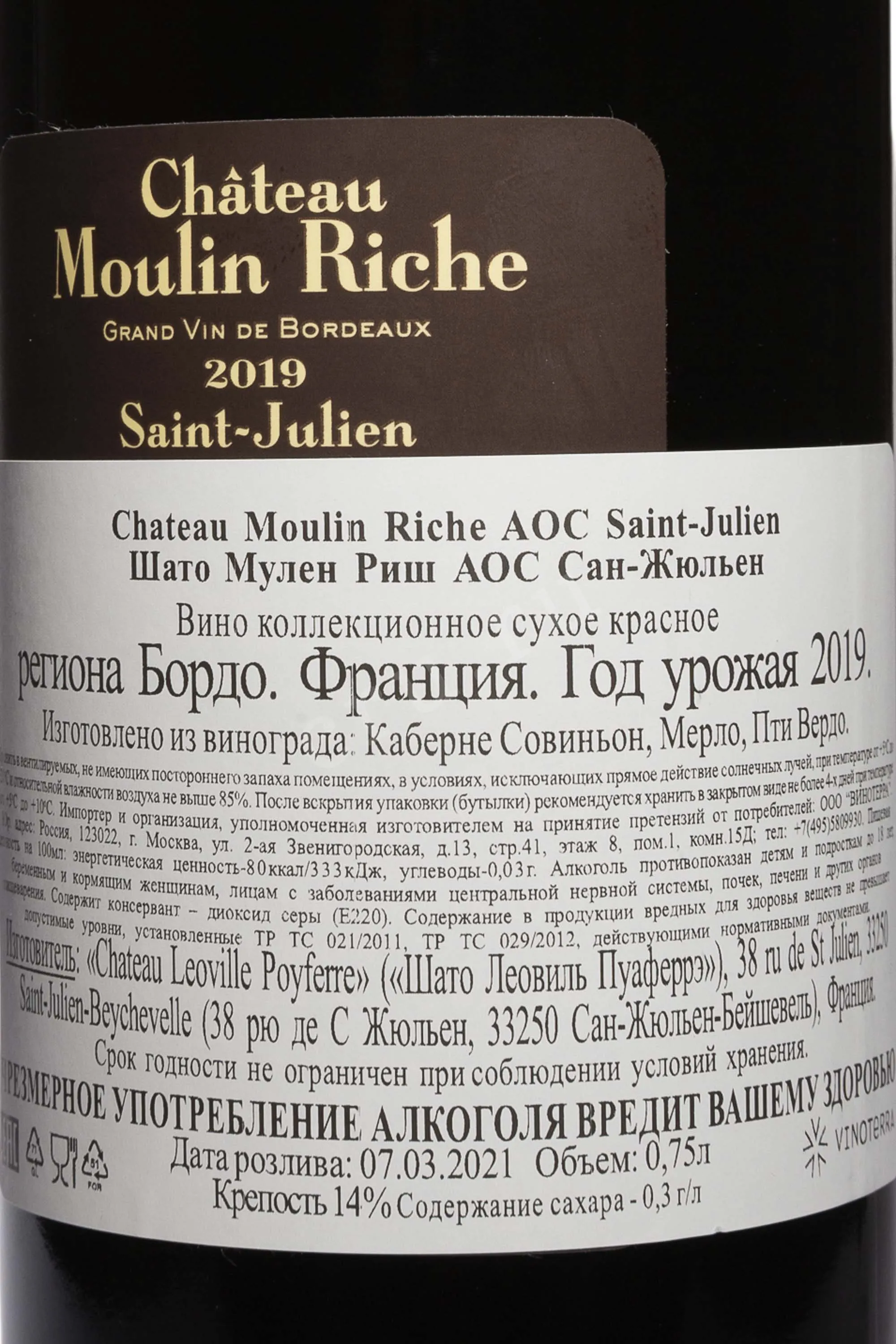 Красное сухое вино Chateau Moulin Riche Saint-Julien AOC 2019 г. 0,75 л создано в Медоке. Виноградники расположены на гравийных почвах с примесью глины, характерных для левого берега Бордо и обеспечивающих хороший дренаж. Урожай собрали при благоприятных погодных условиях, что позволило получить зрелый и сбалансированный виноград. Напиток представлен классическим бордоским ассамбляжем. Ферментация проходила в чанах с температурным контролем, а выдержка — в частично новых бочках из французского дуба, в течение минимум 12 месяцев.