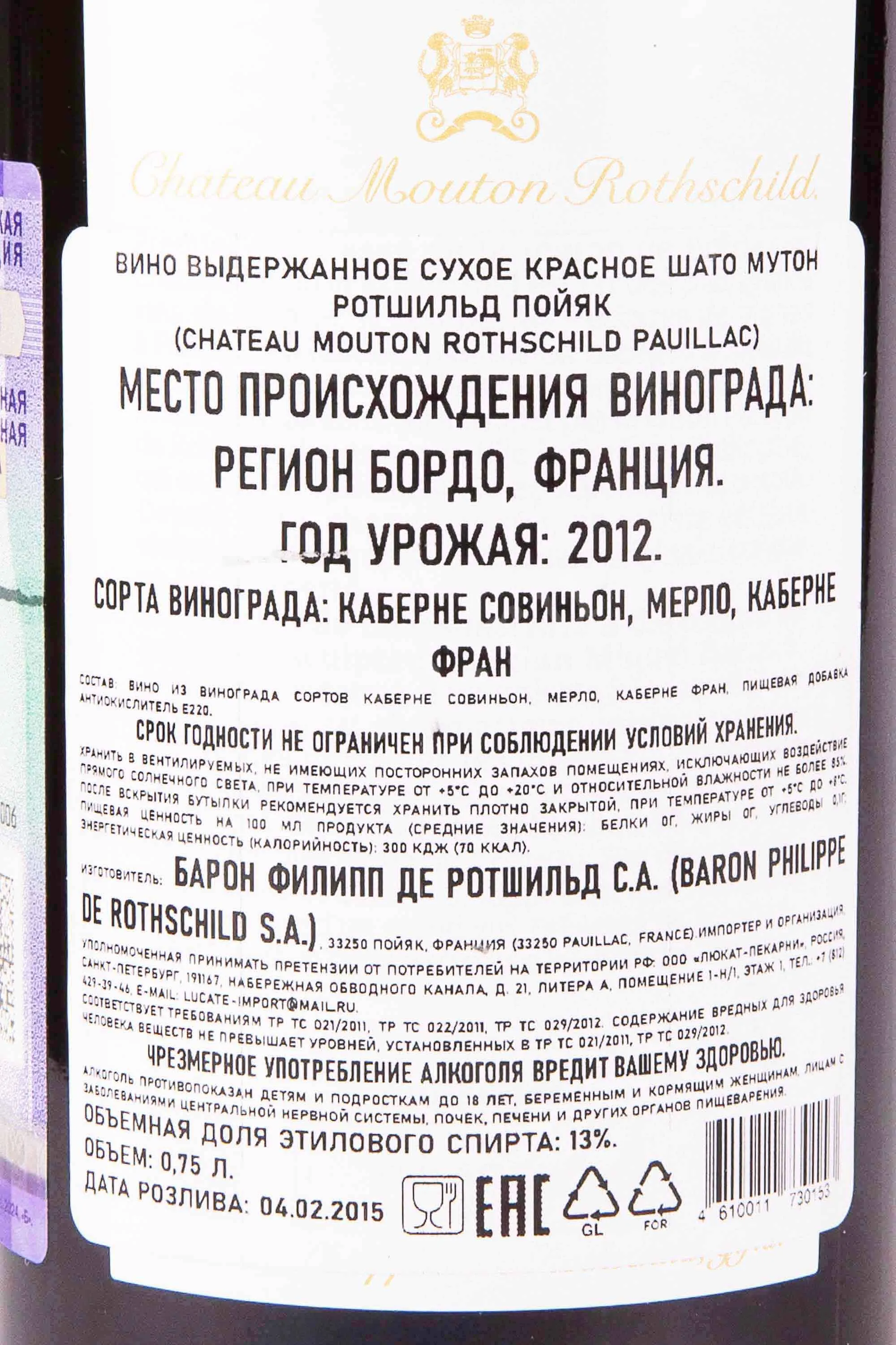 Шато Мутон Ротшильд Пойяк 2012 0.75