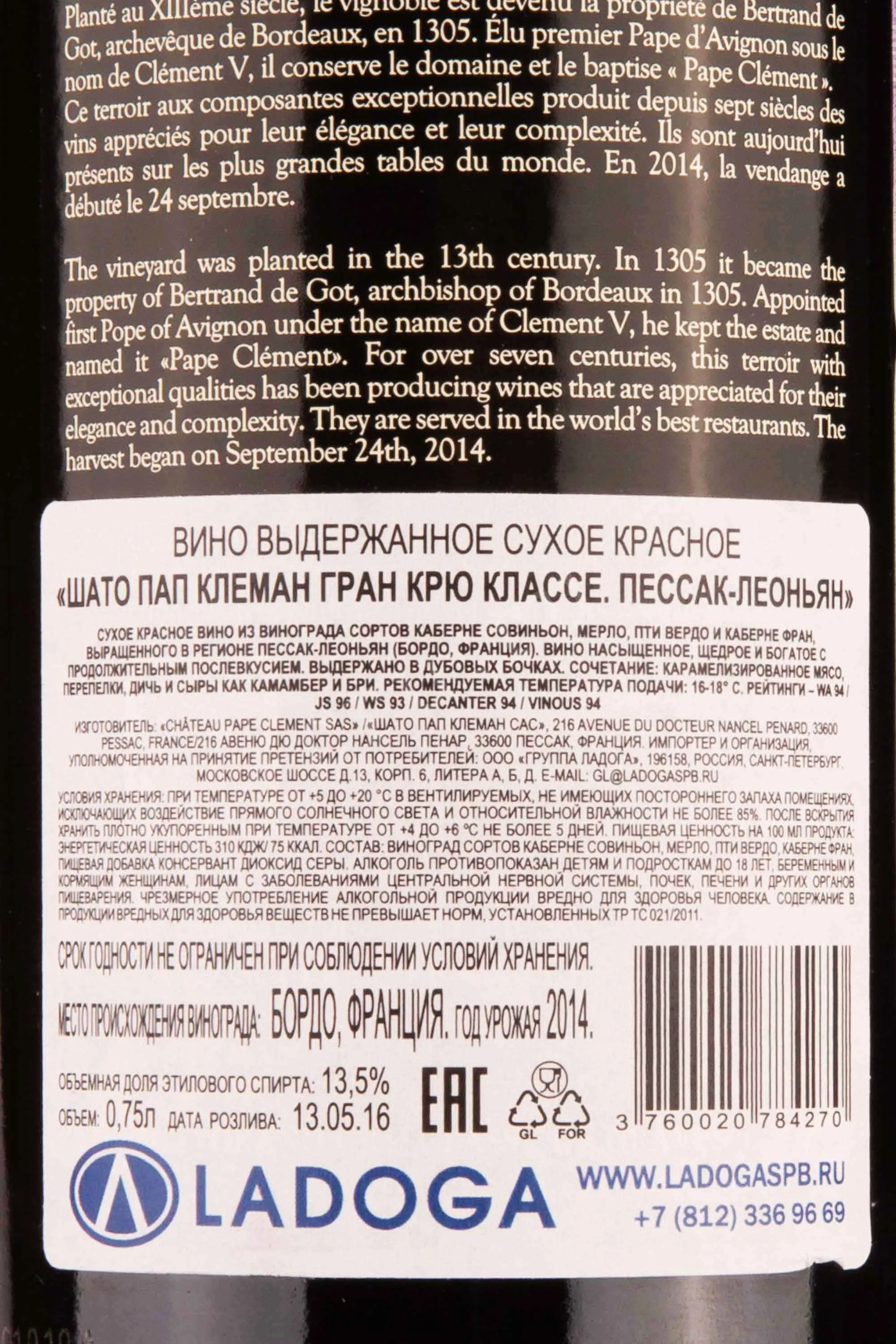 Chateau Pape Clement Grand Cru Classe de Graves Pessac Leognan 2014 0.75 л купить - Французское вино Шато Пап Клеман Гран Крю Классе де Грав Пессак Леоньян цена в магазине г. Москва, ул. Профсоюзная, д. 16/10 10:00-22:00 Ежедневно +7 (495) 920-20-02 info@cru.ru