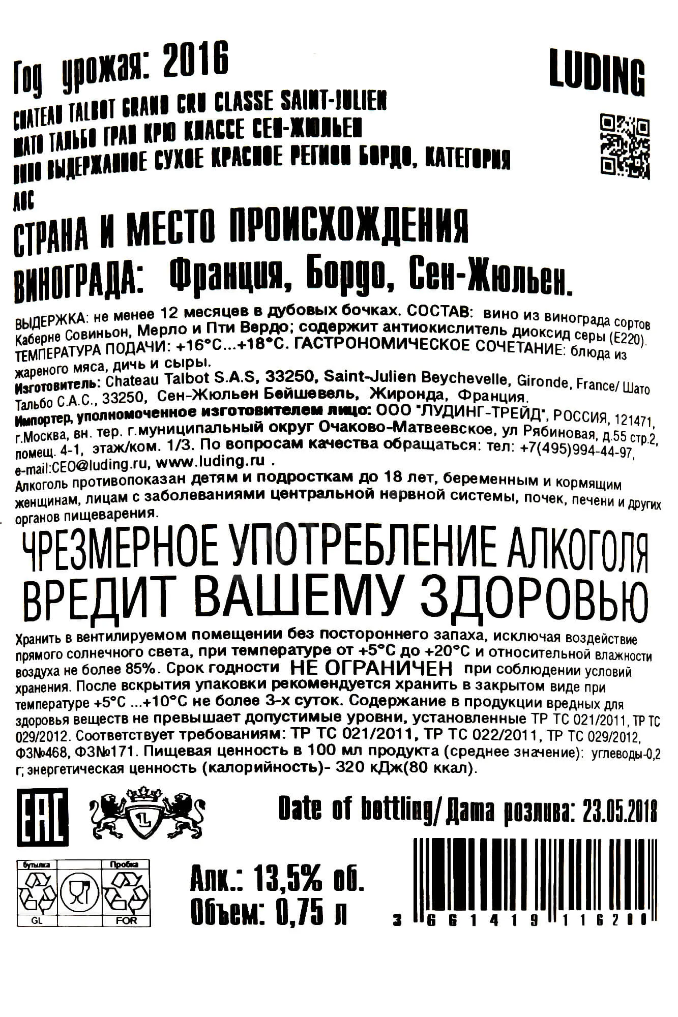 Шато Тальбо Гран Крю Классе Сен Жюльен 2016 0.75