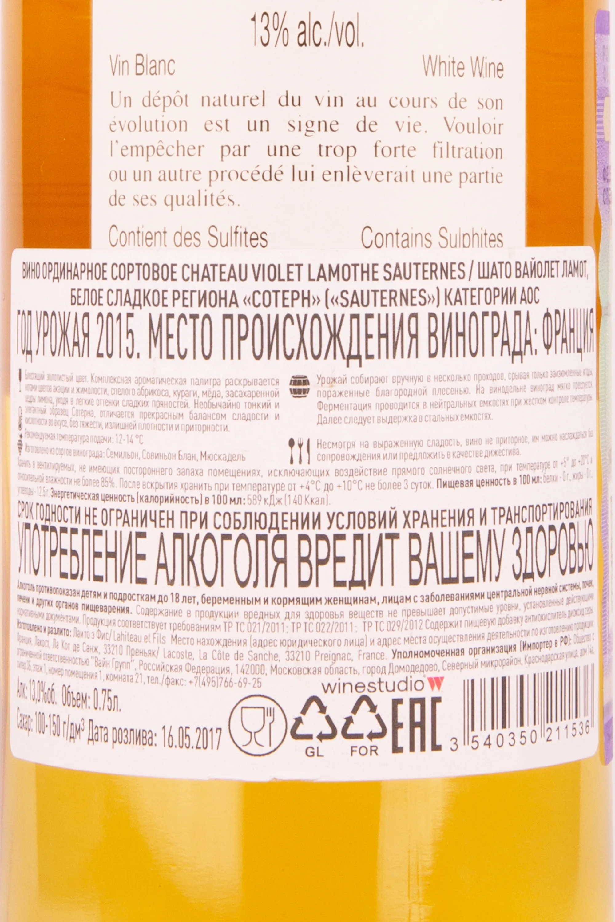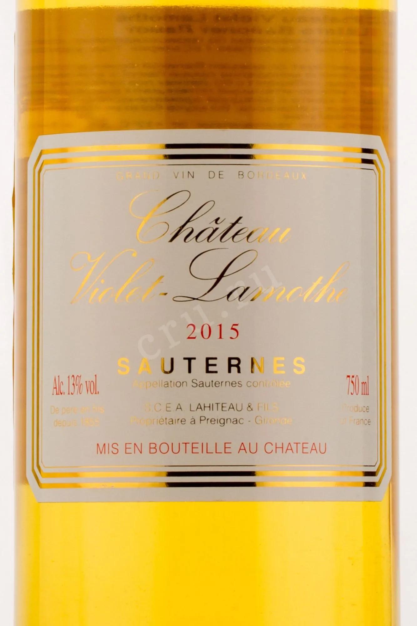 Вино Chateau Violet-Lamothe Sauternes 2015 г. 0.75 l – это изысканный французский винтаж из урожая 2015 года. Виноград, культивируемый в апелласьоне Сотерн, собирают вручную путём последовательной сортировки, а после переработки выдерживают 2 года в цементных чанах, а затем 1 год в дубовых бочках. 13-процентное белое сладкое вино имеет потенциал хранения более 10 лет.