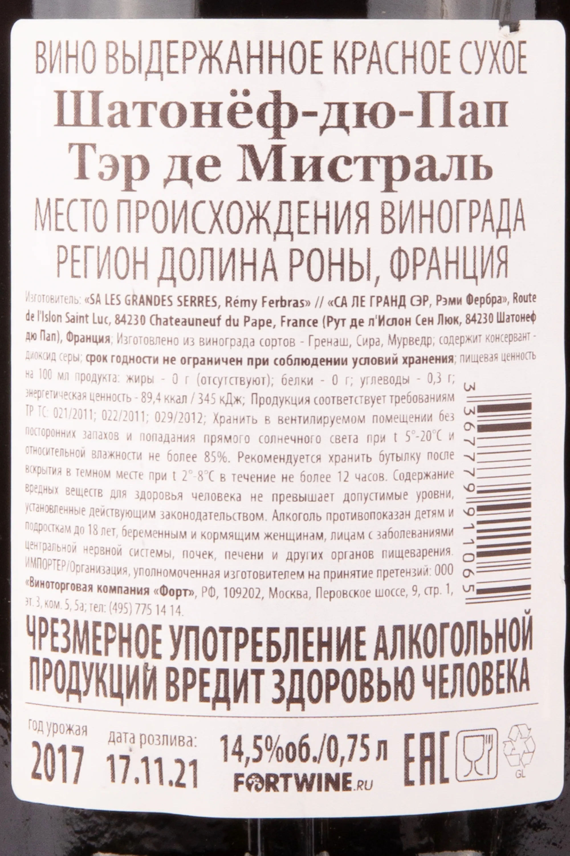 Chateauneuf du Pape Terre de Mistral 2017 0.75 л купить - Французское вино Шатонёф дю Пап Тэр де Мистраль цена в магазине г. Москва, ул. Профсоюзная, д. 16/10 10:00-22:00 Ежедневно +7 (495) 920-20-02 info@cru.ru